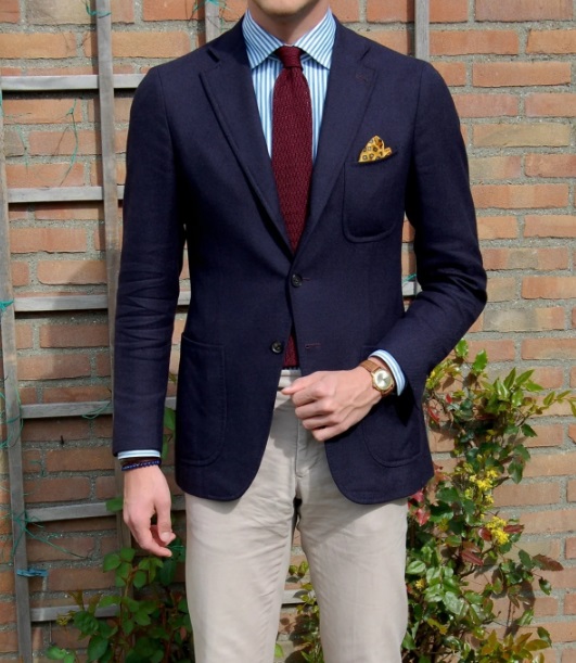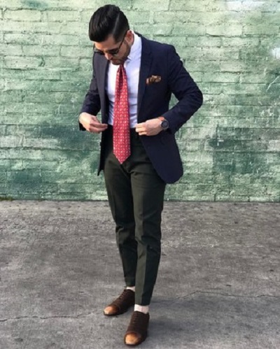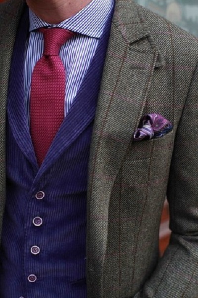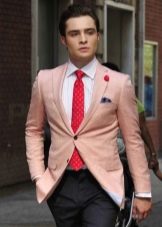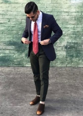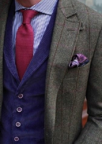 Ähnliche Regeln gelten für Anzüge oder Jacken, die getrennt von einer Hose getragen werden. Diese Elemente einer Herrengarderobe ermöglichen die Verwendung von eher kontrastierenden Kombinationen. Zum Beispiel kann ein Vertreter der starken Hälfte der Menschheit einen grünen Anzug mit einer kontrastierenden karminfarbenen Krawatte ergänzen. Viel häufiger wählt ein Mann jedoch traditionellere Hintergrundtöne: