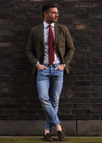 Das Maximum, das hier verwendet werden kann, ist Korallenton sowie gedämpfte Preiselbeere. Krawatten sind kein Kleidungsstück, das modische Fehler zulässt. Wenn Sie sie mit Jeans oder Freizeithosen kombinieren, achten Sie darauf, sie mit einem Hemd oder einer Jacke zu kombinieren.
