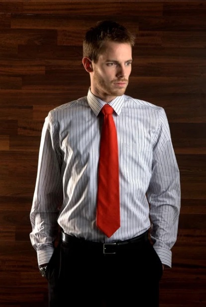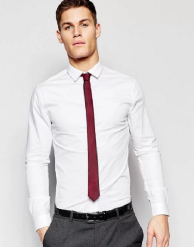 Ein Business-Look hilft Ihnen, ein weißes oder graues Hemd mit einer Krawatte in reinem Karminrot, Scharlach oder Koralle zu kreieren. Auch ein Hemd im Elfenbeinton - Elfenbein und Blau - passt ganz gut in den offiziellen Dresscode. Mit ihnen sieht eine einfarbig strukturierte rote Krawatte oder ein glattes Seidenprodukt mit Nadelstreifen sehr vorteilhaft aus.