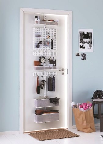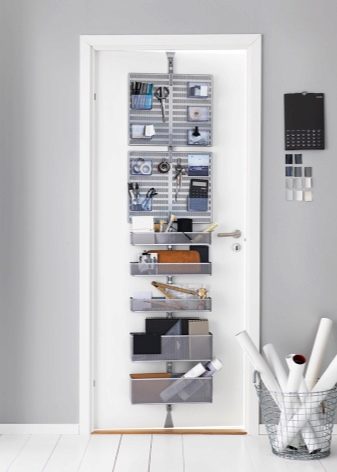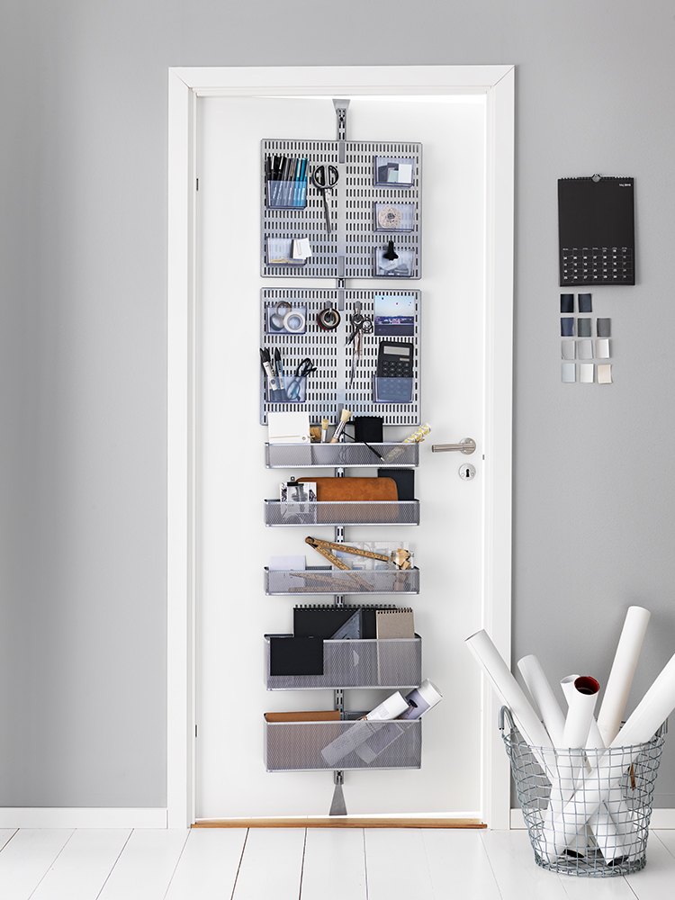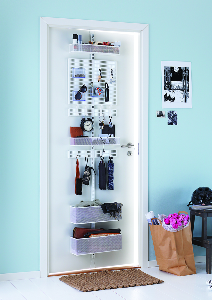 Türen können nicht nur einen bestimmten Raum öffnen und schließen, sondern auch als Stauraum dienen. Elfa bietet seinen Kunden die Utility Door-Systeme an. Dank ihrer Verwendung fungieren Türen als komplettes System zur Aufbewahrung bestimmter Gegenstände. Um ein solches Aufbewahrungssystem zu organisieren, müssen keine speziellen Befestigungselemente verwendet oder die Tür selbst gebohrt werden. Der Spannmechanismus sichert die vertikale Schiene, ohne die Türoberfläche zu beschädigen. Auf einer solchen Oberfläche können Körbe verschiedener Größen, Haken, Lochplatten platziert werden.