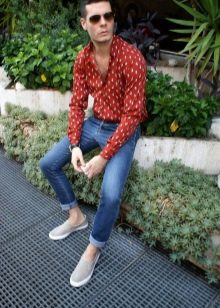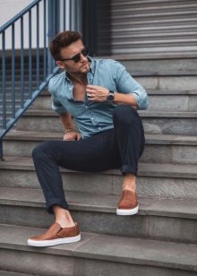 Slip-Ons aus echtem Leder oder Öko-Leder lassen sich gut kombinieren mit leichter Hose... In diesem Outfit können Sie spazieren gehen oder ein Restaurant besuchen. Als Oberteil eignet sich ein zur Hose passender Pullover.