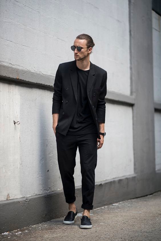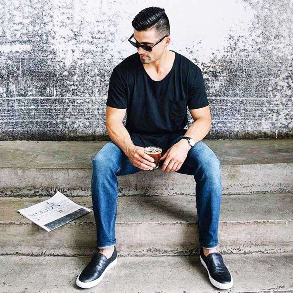 Slipper passen gut mit Jeanshosen, während die Farbkombination keine große Rolle spielt. Die besten Kombinationen sind blaue Jeans, schwarze Slip-On-Sneaker und ein beliebiges T-Shirt.