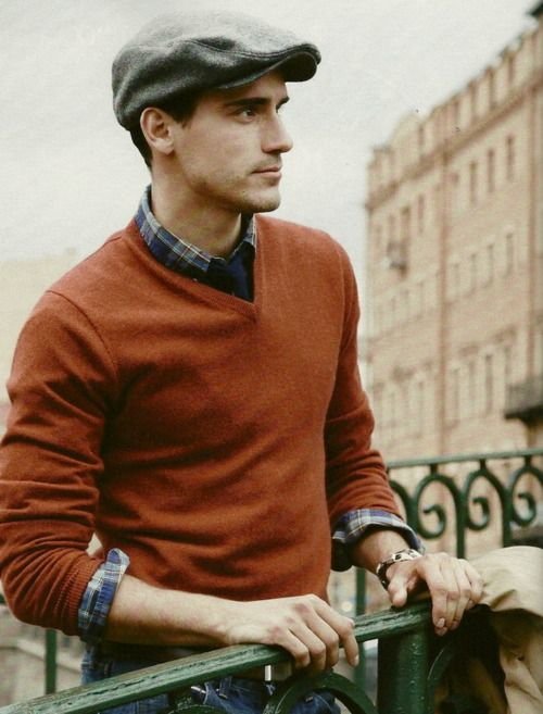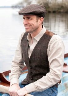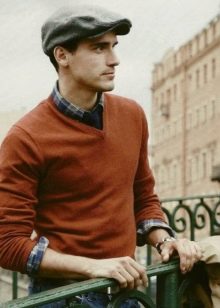 - Ein klassischer Look für einen entspannten Office-Dresscode oder gemütliches Landleben harmoniert auch mit der traditionellen Schiebermütze der mittleren Größe. Es kann mit einer gesteppten kurzen Jacke, einer olivgrünen Hose mit Bündchen, hellen Socken und braunen Stiefeln ergänzt werden. Ein Hemd mit Krawatte und ein feiner Wollpullover mit V-Ausschnitt schaffen ein Gefühl von Integrität und Vollständigkeit der Schleife.
