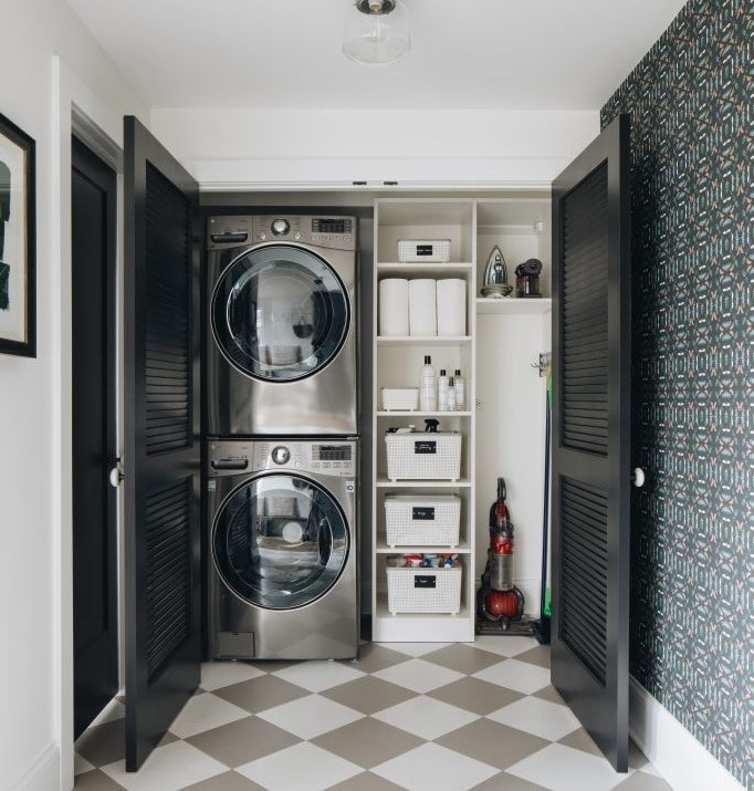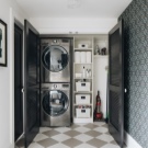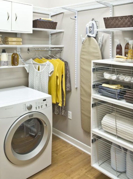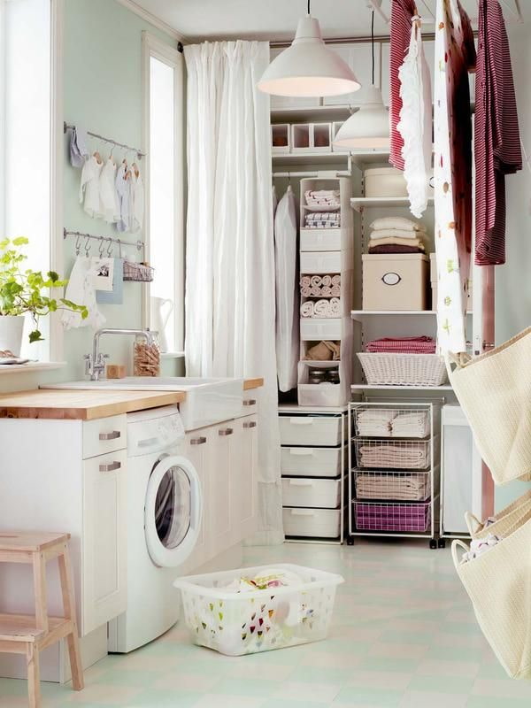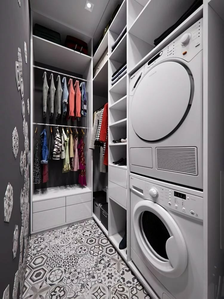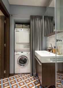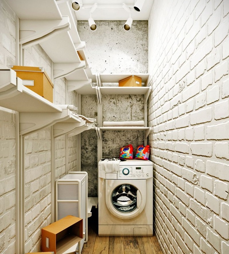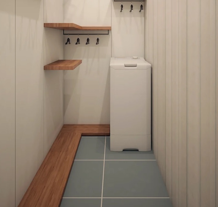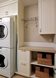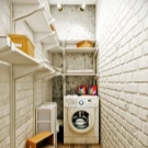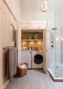 - In der Waschküche ist es besser, Fliesen auf Boden und Wände zu legen, da hier auf jeden Fall Feuchtigkeit vorhanden ist. Bei den Farbtönen sind Lichtoptionen vorzuziehen, insbesondere wenn der Raum klein ist und kein Fenster hat.