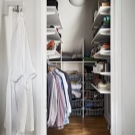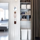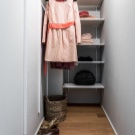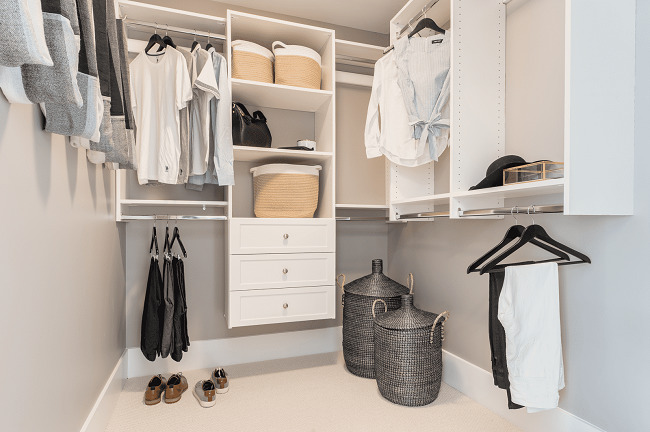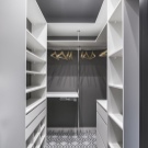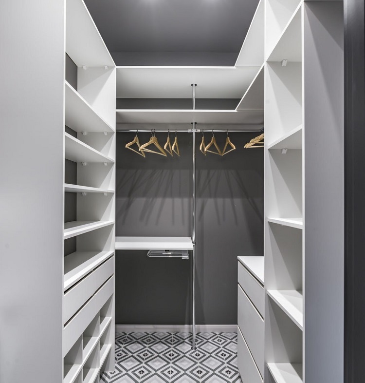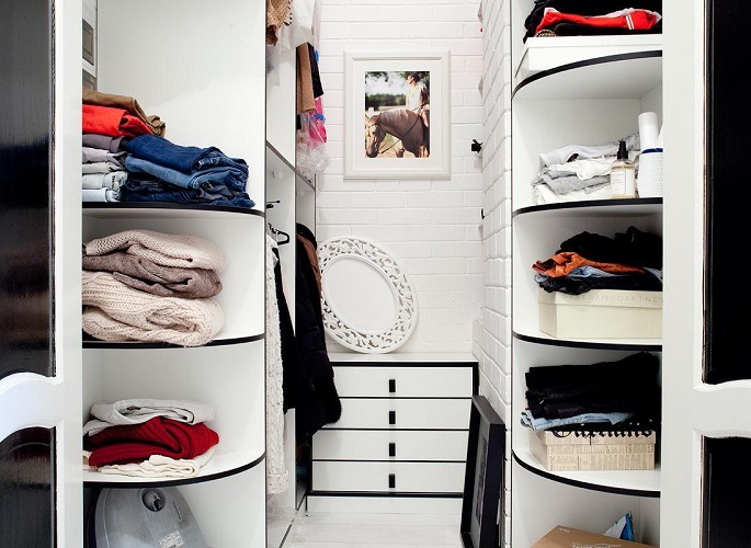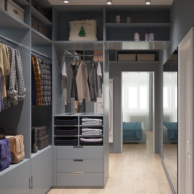 Diese Option ist sehr praktisch, wenn sich die Speisekammer im Schlafzimmer befindet. Es bietet Platz für viele offene Regale und geschlossene Schränke, in denen Sie die unterschiedlichsten Dinge aufbewahren können - von Unterwäsche über Jeans bis hin zu Pullovern.