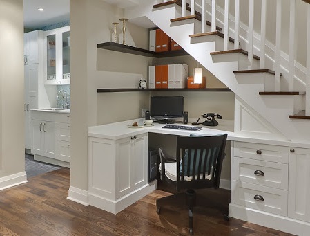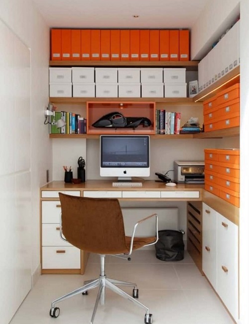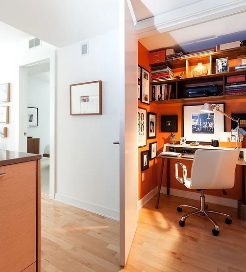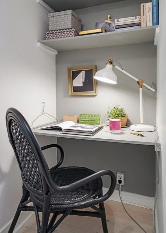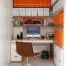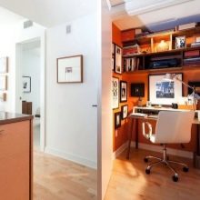 - Sie können den Raum in Ihrem Büro organisieren, indem Sie nur die notwendigsten Möbel platzieren: einen Schreibtisch, einen bequemen Stuhl oder einen Sessel. Es ist gut, wenn Sie mehrere Regale für die notwendigen Bücher und Dokumente platzieren können.