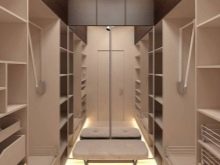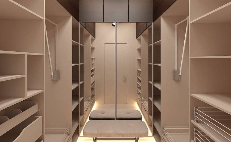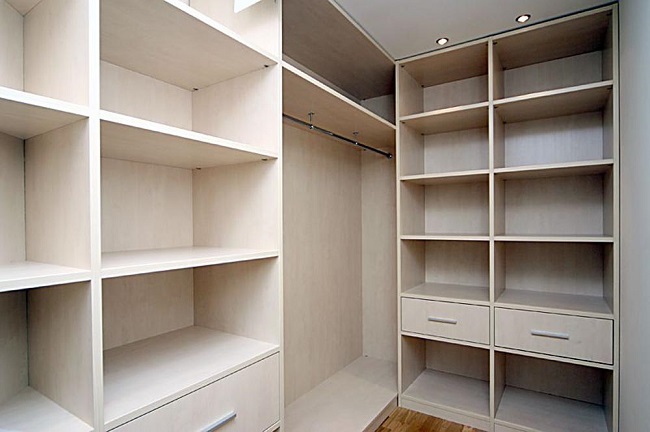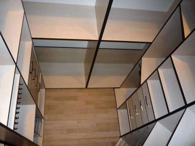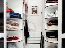 - Ein so geräumiges und gemütliches Ankleidezimmer kann in einer Speisekammer ausgestattet werden. Regale für Schuhe, Kleiderbügel, Kästen für Kleinigkeiten helfen, den Raum in Ordnung zu halten. Dazu kommt eine gute Beleuchtung und ein modernes Design.