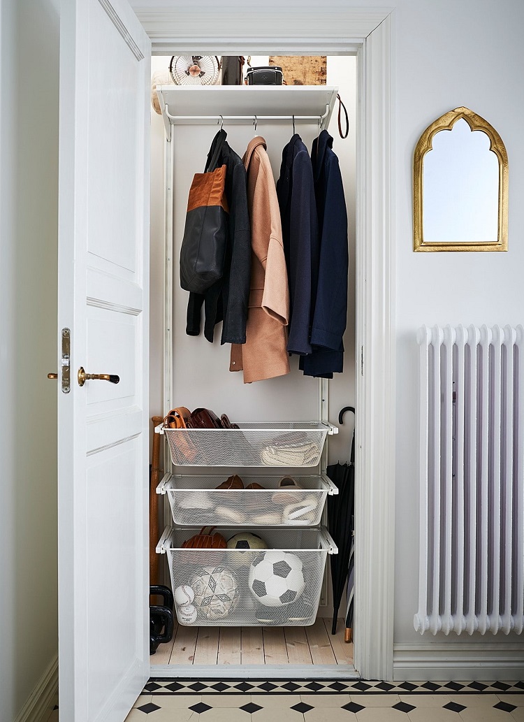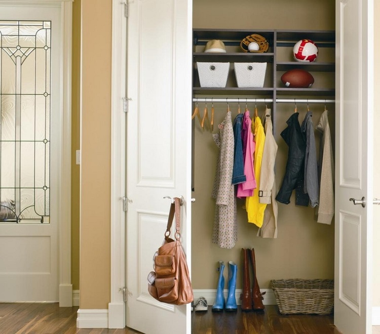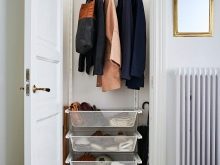 Eine gute Lösung wären spezielle Container, verschiedene Module zum Aufbewahren von Dingen. Für Kleider und Mäntel sollten separate Kleiderbügel angebracht werden. Darunter können Sie Schuhregale platzieren.