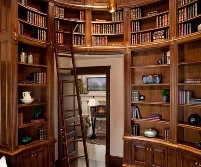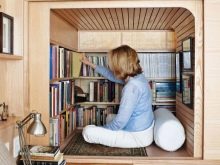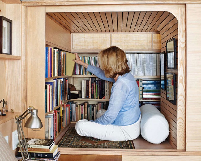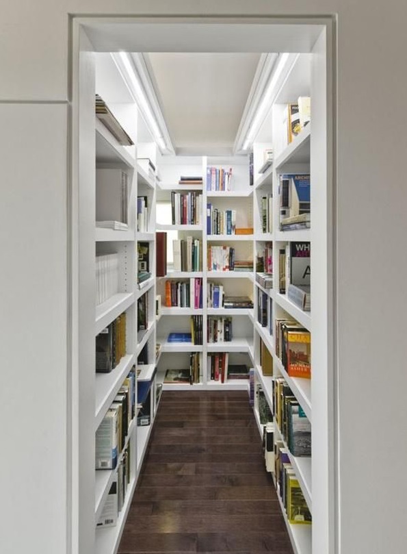 - In einer kleinen Bibliothek sollten Regale bis zur Decke angebracht werden, damit alle Bücher ihren Platz in den Regalen finden. Hier kann ein gemütlicher Sessel mit Decke nicht schaden.