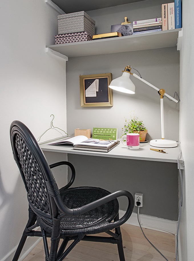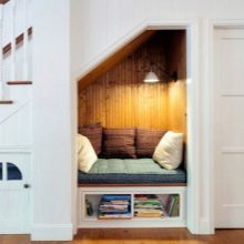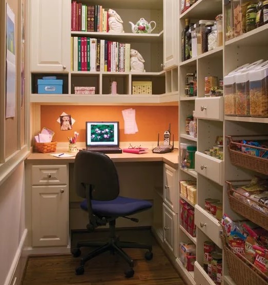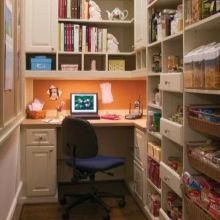 Ein guter Ort für ein Büro, in dem Sie sich konzentrieren und ruhig arbeiten können. Es reicht aus, einen kleinen Tisch, einen bequemen Stuhl und eine helle Schreibtischlampe aufzustellen. Das Schlafzimmer kann auch ausgestattet werden, aber für einen guten Schlaf ist weiterhin eine regelmäßige Belüftung des Raumes erforderlich. Wenn die Speisekammer an eine Außenwand grenzt, können Sie dort ein kleines Fenster machen. Es kommt vor, dass in den Lagerräumen bereits vorab ein Loch vorgesehen ist.