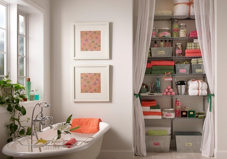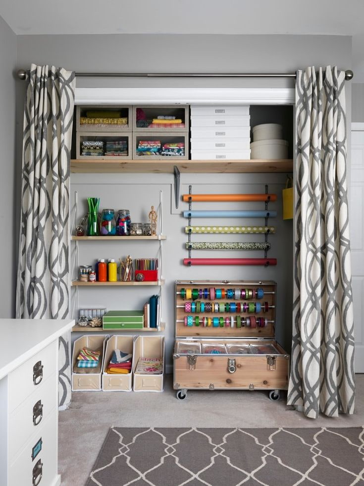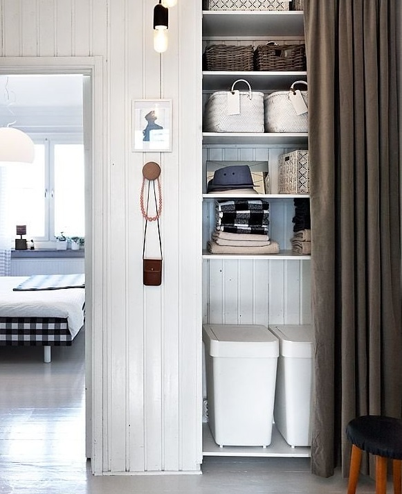 Kleine Vorratskammern zum Aufbewahren bestimmter Dinge können mit Vorhängen, Jalousien und Rollläden versteckt werden. Wenn es nur eine Nische ist, können Sie diesen Raum mit einem Bildschirm schließen, der zum Gesamtkonzept passt.