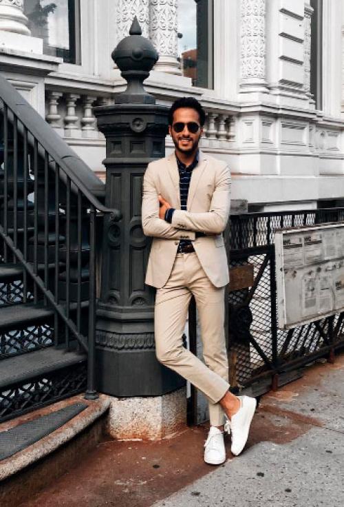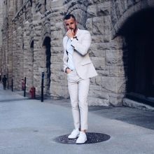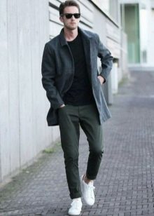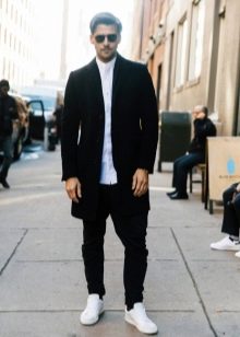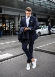 Sneaker können mit Anzügen kombiniert werden, wenn sie einfarbig, lakonisch und zurückhaltend gestaltet sind. Vorausgesetzt, der Schnitt der Kleidung ist lässiger. Sneaker können nicht mit einem strengen Business-Anzug kombiniert werden.