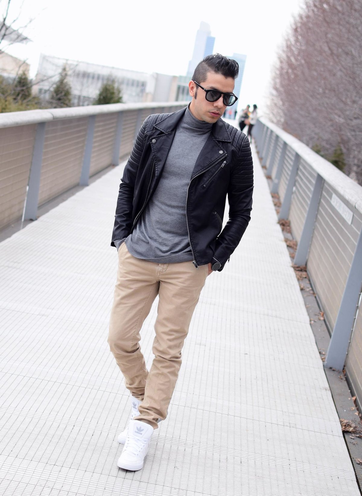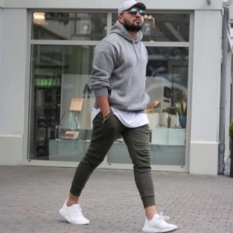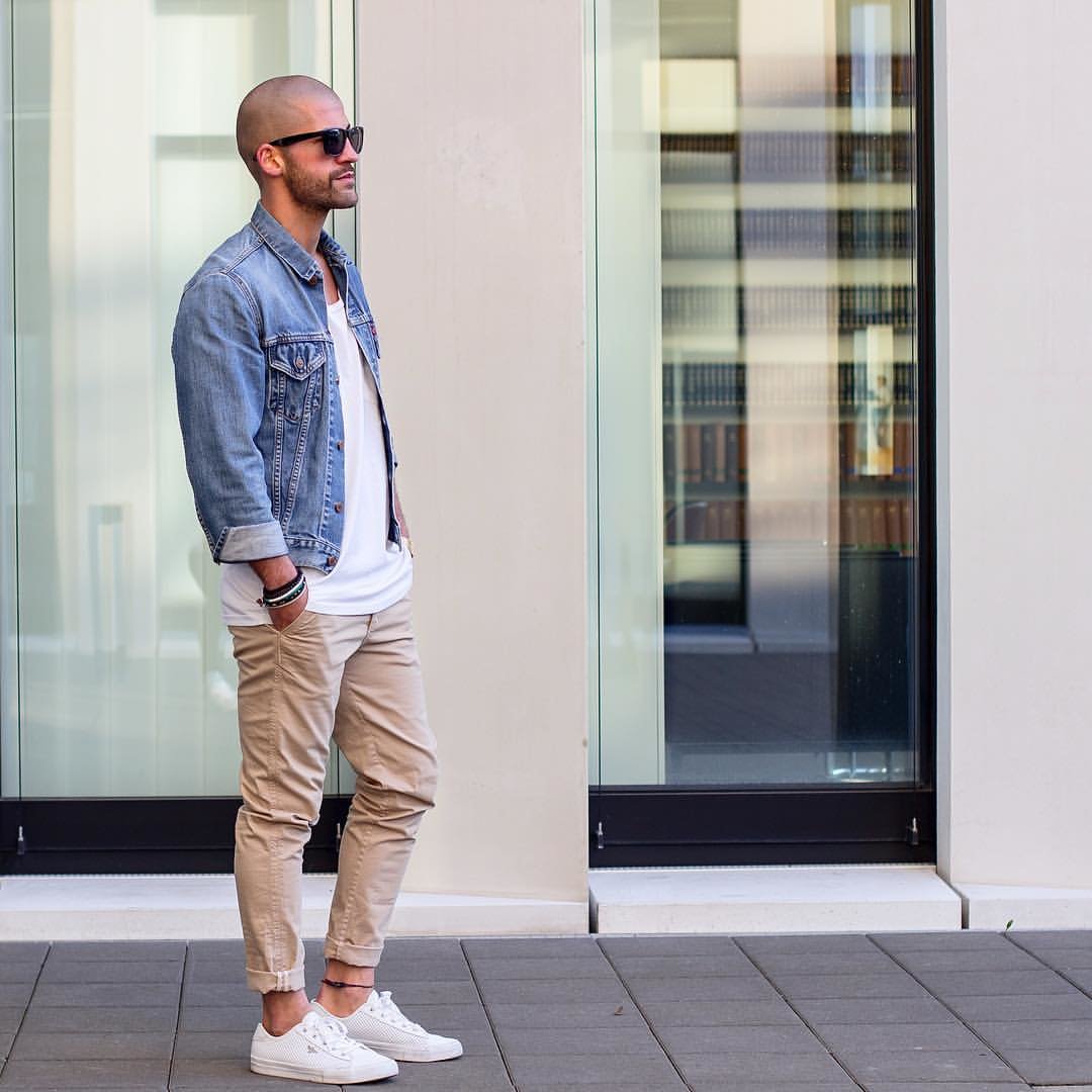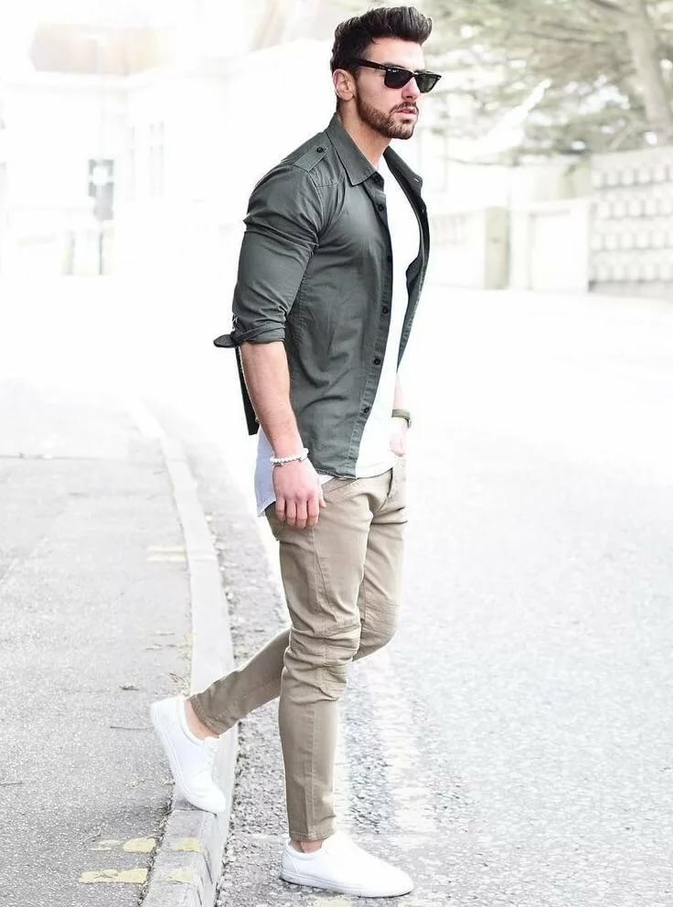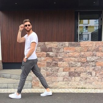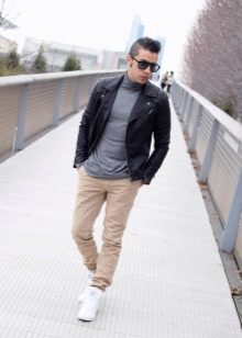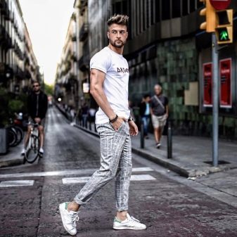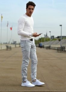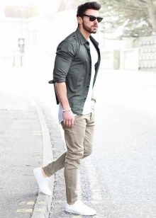 In diesem Fall zu den Schuhen besser Chino wählen. Achten Sie auf die Optionen bei hellen Stoffen. Beige Hosen sind ideal für eine heiße Zeit. Im Winter können weiße Sneaker zu dunklen Chinos getragen werden.