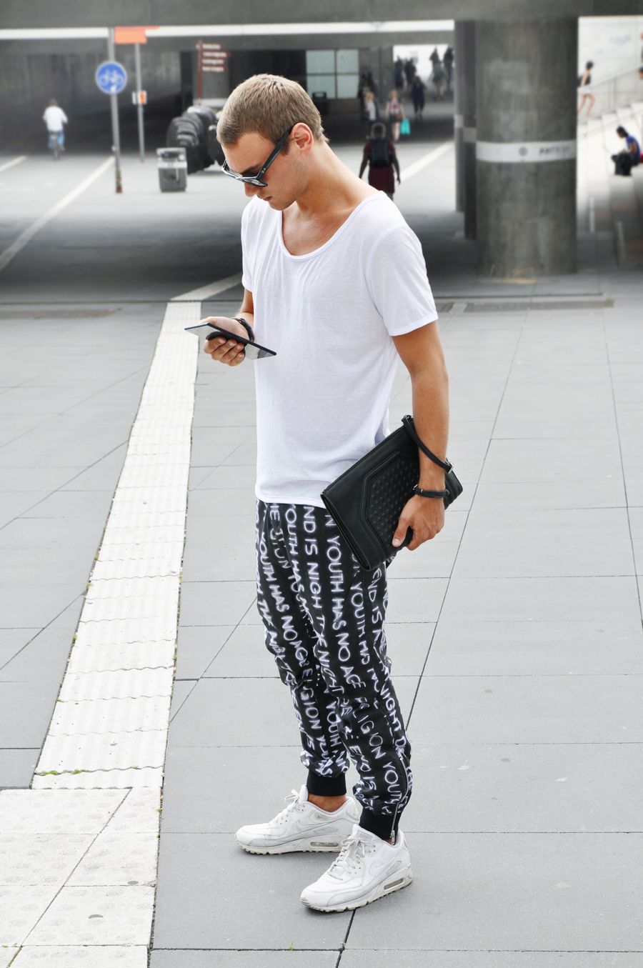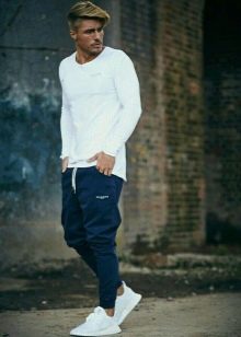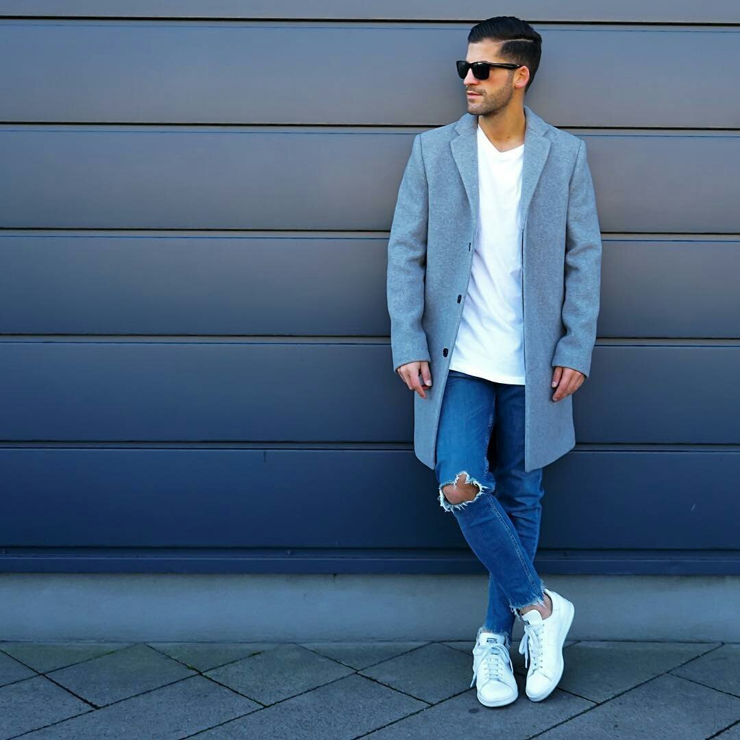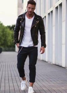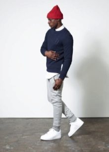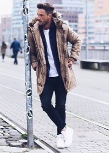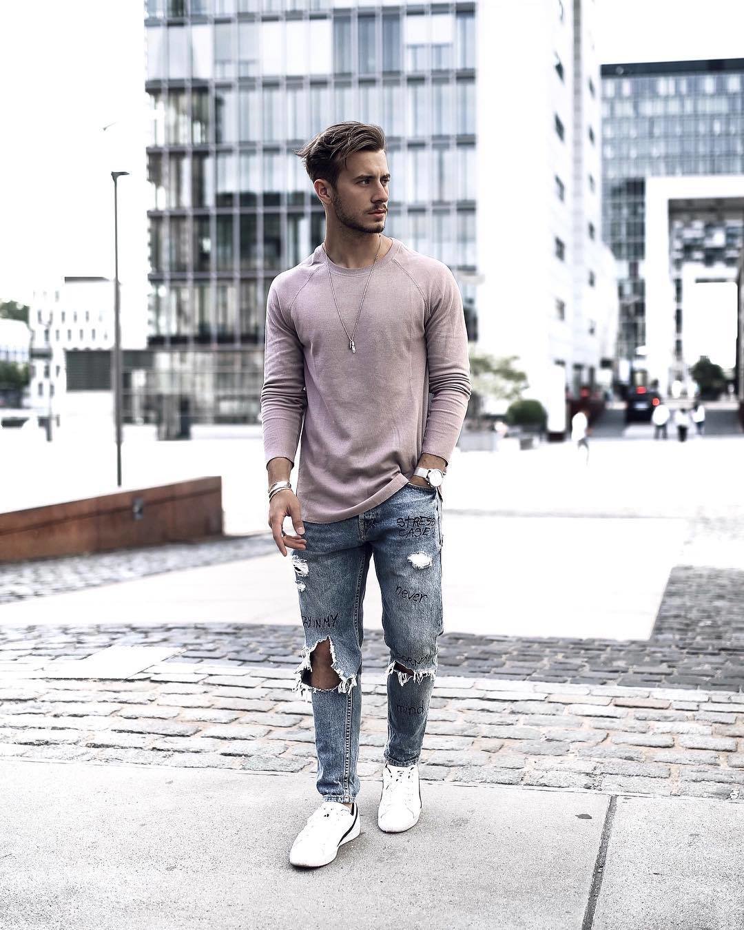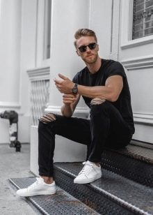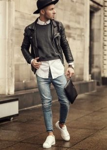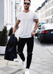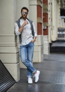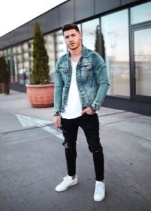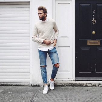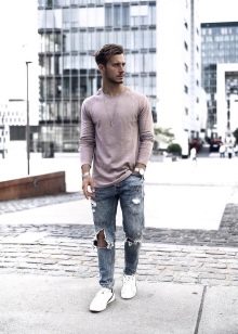Für junge und exzentrische Vertreter des stärkeren Geschlechts empfehlen Designer die Kombination von Sneakers mit zerrissenen Jeans. Dieser Stil sieht mutig aus und zieht die Aufmerksamkeit anderer auf sich.