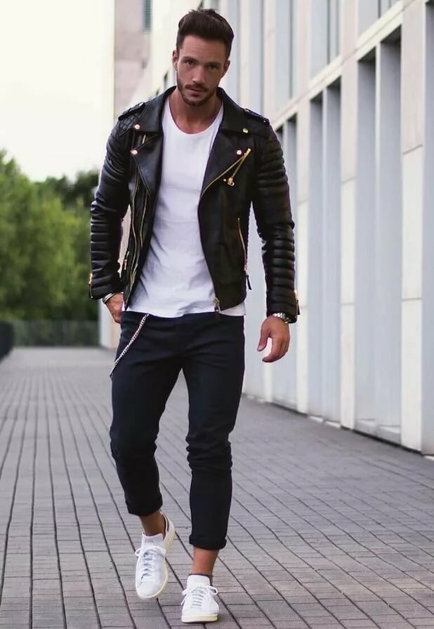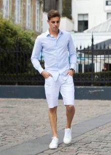 Sneaker sollten nicht mit dekorativen Elementen verziert werden. Bei einem lässigen Look mit schneeweißen Sneakers sehen helle Hemden und ein Unterteil in derselben Farbe toll aus. Die Jacke kann schwarz sein.