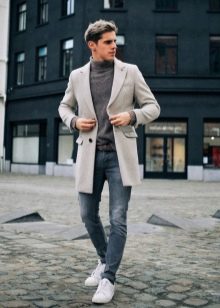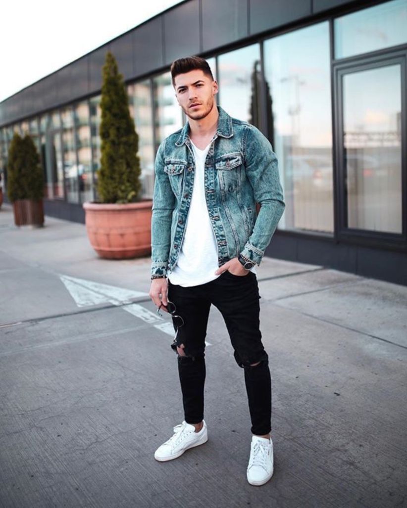 Diese Jahreszeit ist ideal für lebendige Looks und Experimente. Helle Sneaker harmonieren perfekt mit den verlängerten Jeansjacken. Für erwachsene Männer ist es besser, eine Jacke zu wählen. Für junge Männer empfehlen Designer, ein Sweatshirt zu wählen. Für einen Frühlingslook eignen sich auch zerrissene Jeans in jeder Farbe.