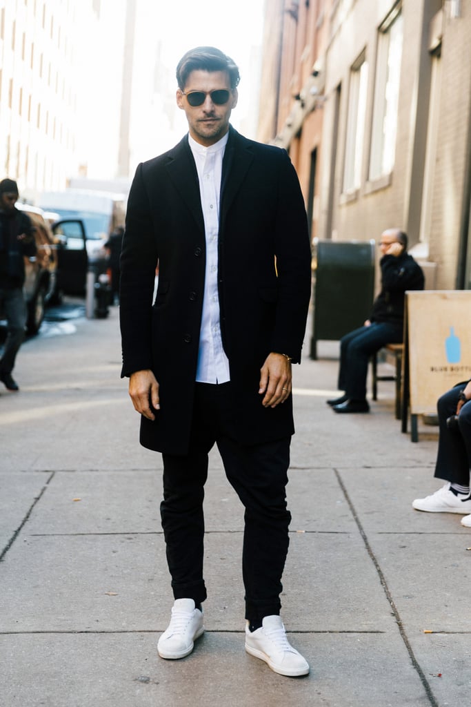 Weiße Sneaker sehen toll aus mit Jeans irgendeine Farbe... Das Ergebnis ist ein trendiger Look für den Alltag und für informelle Meetings. Um eine kontrastreiche Kombination zu schaffen, werden schneeweiße Schuhe mit schwarzen Jeans getragen. Sie können das Bild mit einem Hemd oder T-Shirt ergänzen. Wählen Sie als Oberbekleidung einen klassischen Mantel oder eine Sportjacke.