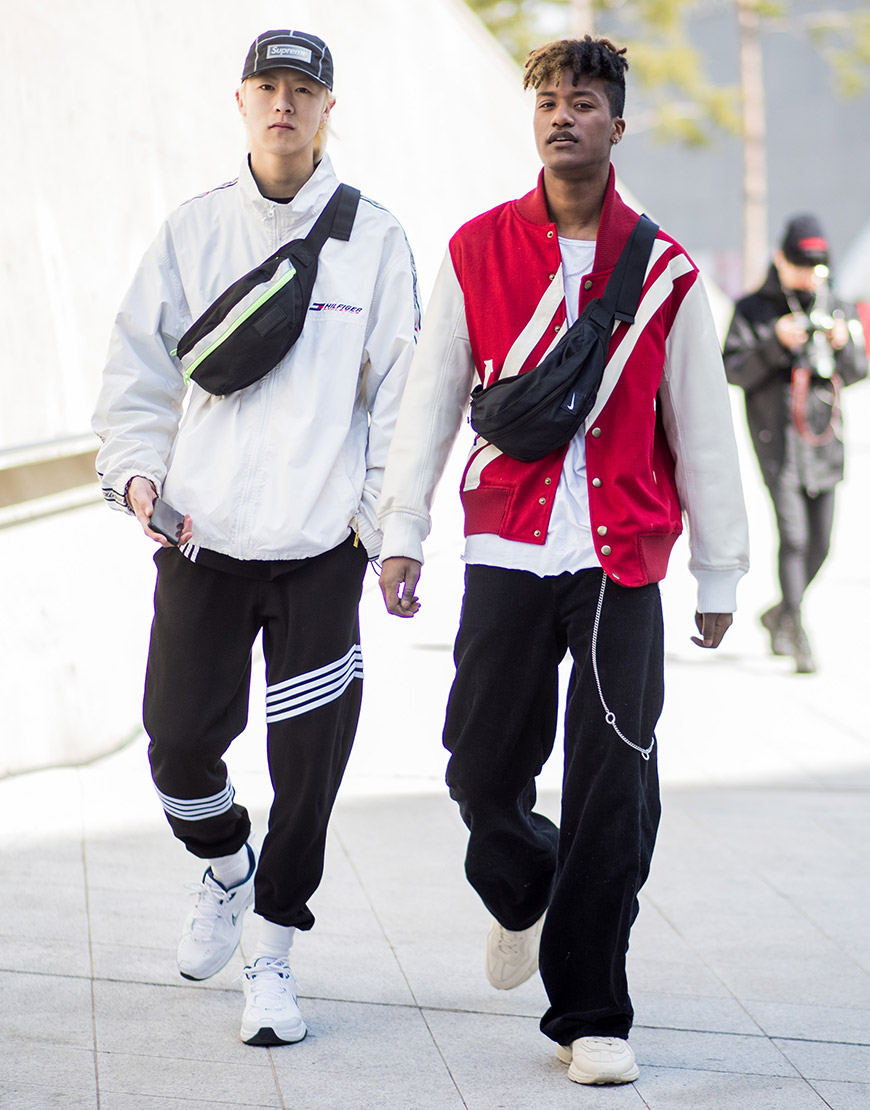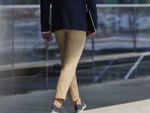 - Schwarze Ledersneaker passen perfekt zu schwarzen Jeans oder Hosen. Darüber kannst du eine schwarze oder marineblaue Bomberjacke tragen. Sie können das Bild mit einem voluminösen Stoffrucksack oder einem stilvollen Etui ergänzen.