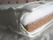 Der Matratzenbezug kann in einer normalen Maschine gewaschen werden, wobei ein Programm entsprechend der Stoffart gewählt wird. Es sollte erwähnt werden, dass für kleine Kinder gekaufte Produkte mit Kokosfasern manchmal dringende Maßnahmen erfordern, um den unangenehmen Geruch loszuwerden. Es wird angenommen, dass in diesem Fall versucht werden kann, einen kleinen einteiligen Füllstoffblock in Seifenwasser zu verarbeiten, aber Sie sollten sich darauf einstellen, dass das Produkt wahrscheinlich beschädigt wird oder vollständig ausfällt. Nach dem Abspülen wird eine leicht angefeuchtete Abdeckung darauf gelegt und im begradigten Zustand getrocknet.