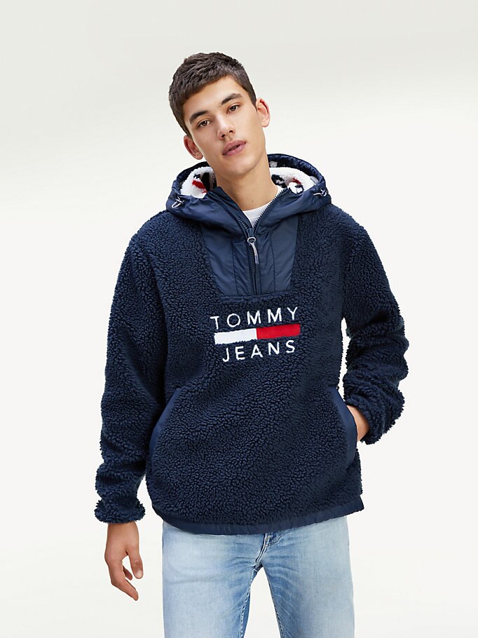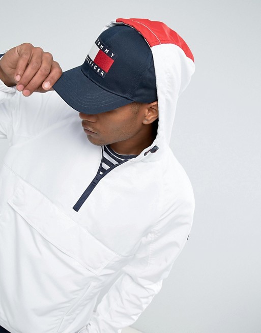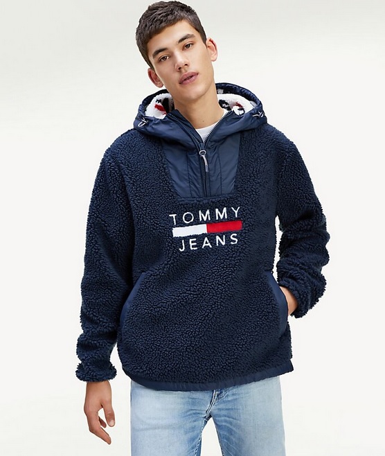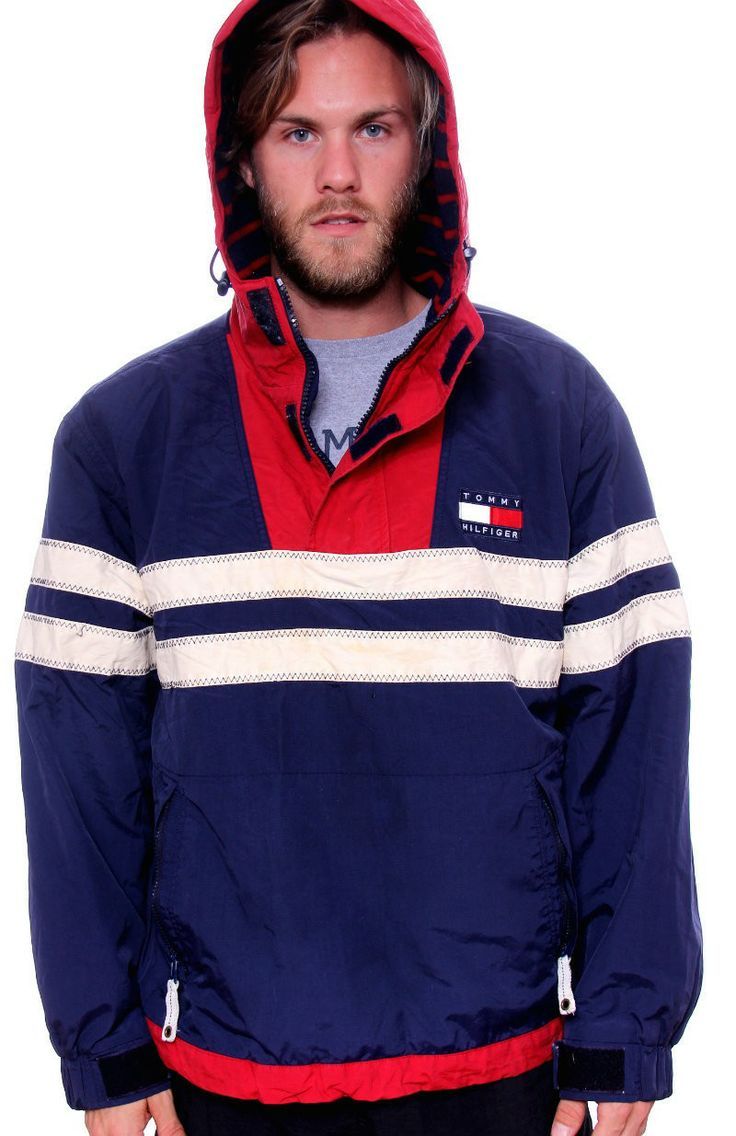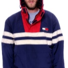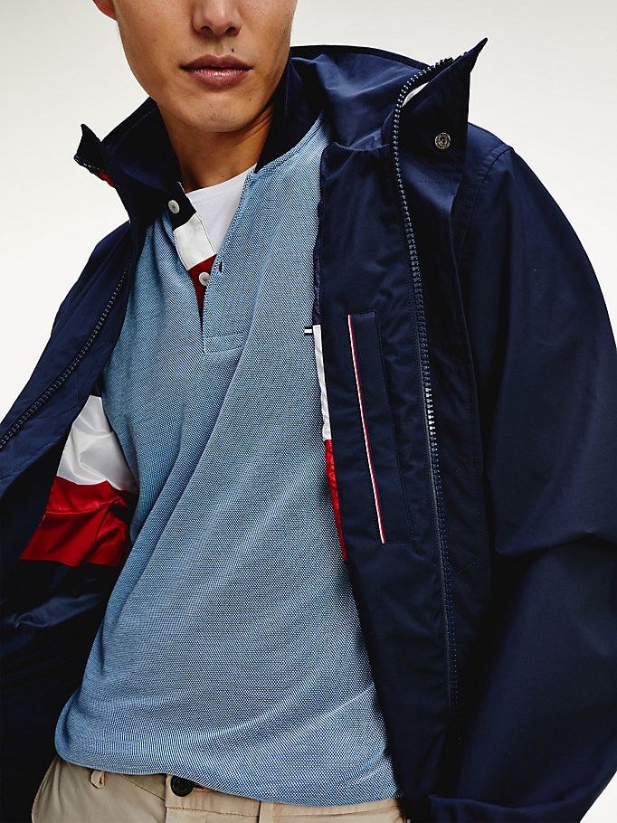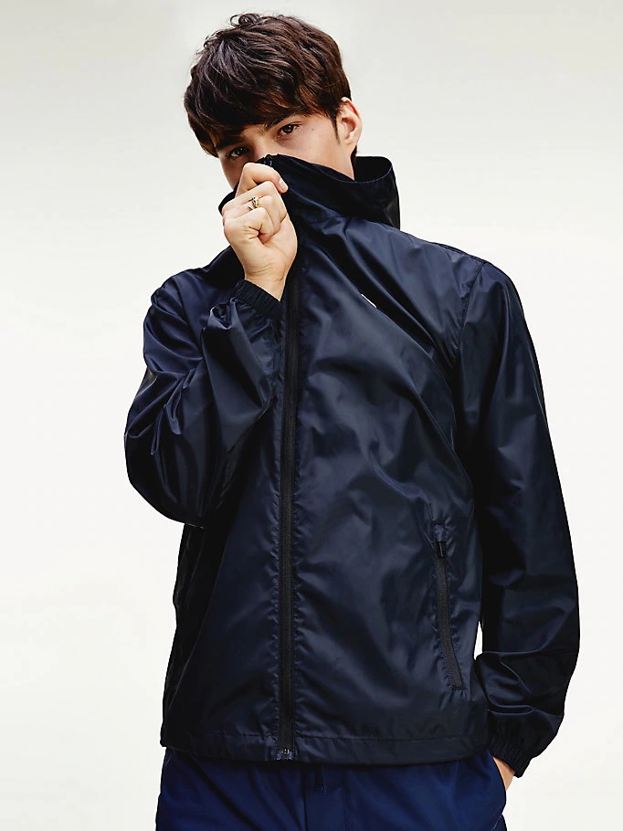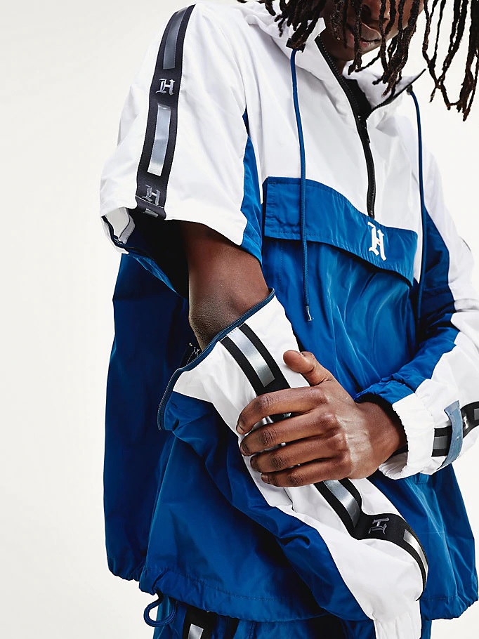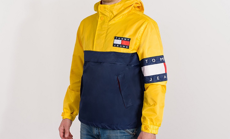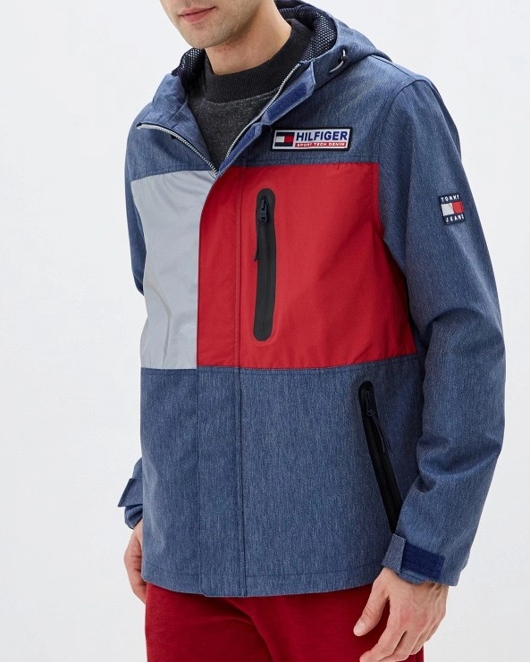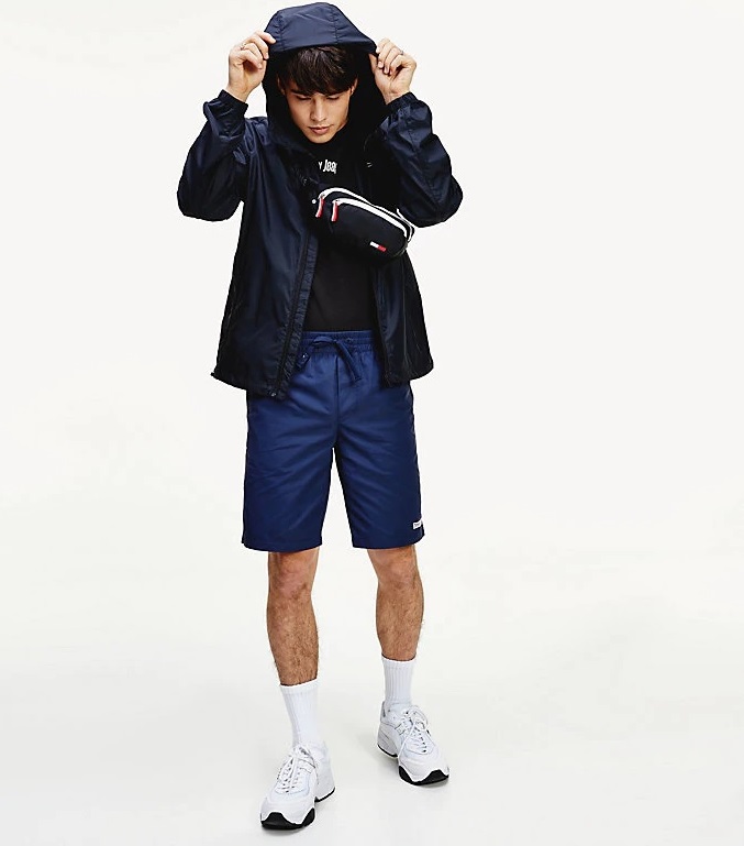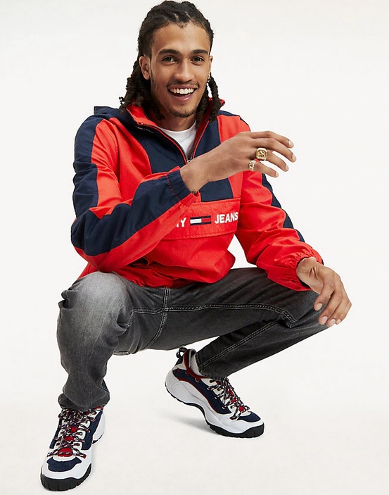 Zu den interessanten Details des Windbreakers gehören eine Kapuze und ein Reißverschluss, elastische Bündchen und Reißverschlusstaschen sowie Tommy Jeans-Branding-Branding und eine erkennbare blau-rot-weiße Flagge.