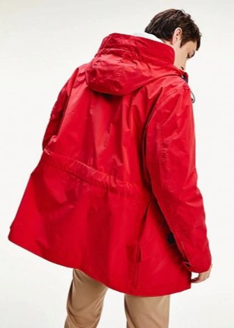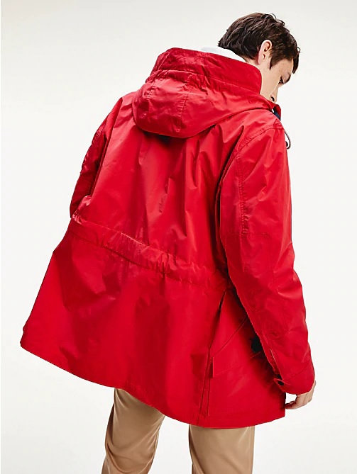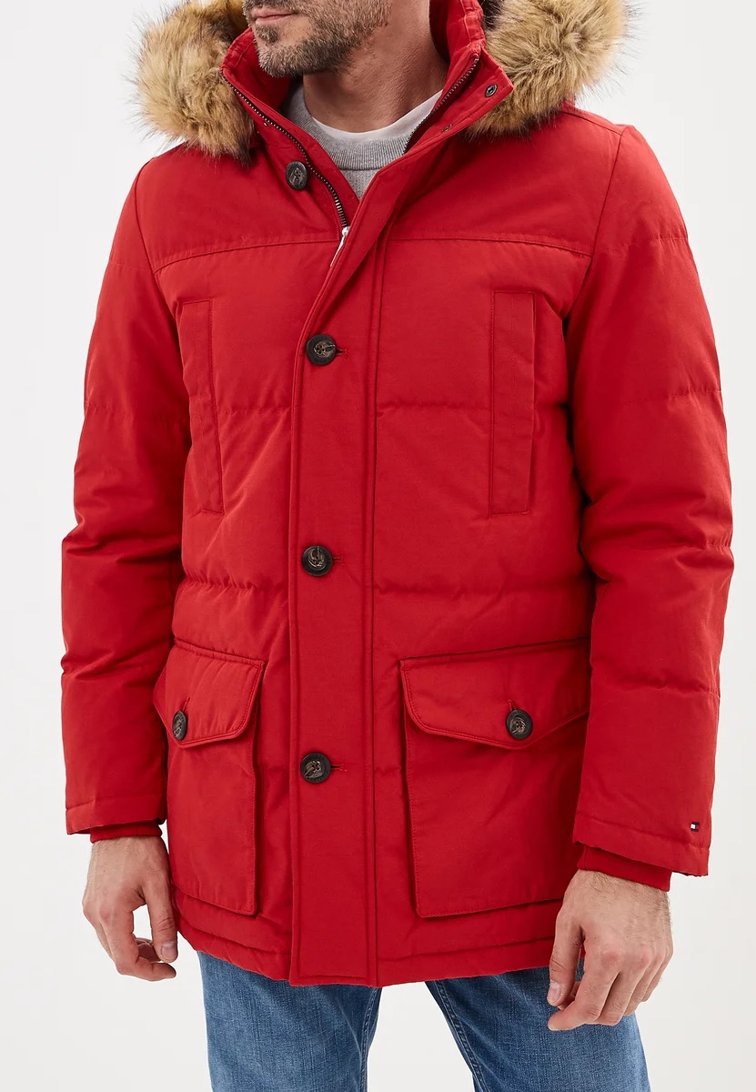 Zum Beispiel, ICONS-Park leuchtendes Rot im sportlichen Style, aus dichtem Textil mit wattierender Polyester-Isolierung. Diese modische Herrengarderobe umfasst eine Kapuze mit Kordelzug, einen Reißverschluss, eine geknöpfte Patte, große Brust- und seitliche Pattentaschen, verstellbare Passform und Manschetten sowie das traditionelle erkennbare TH-Emblem.