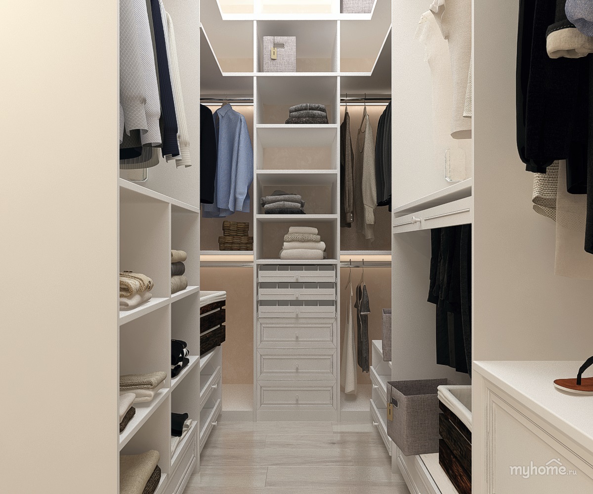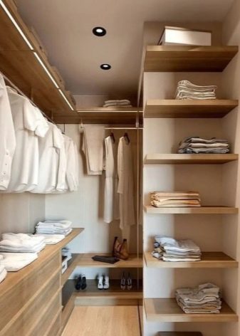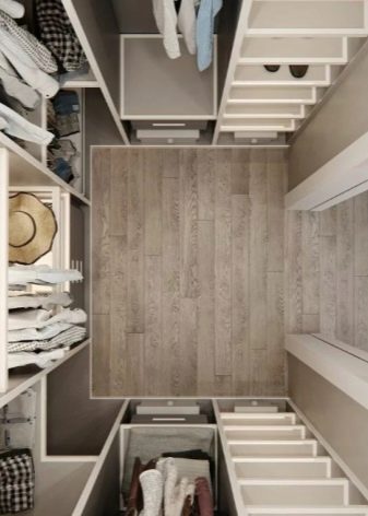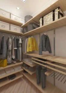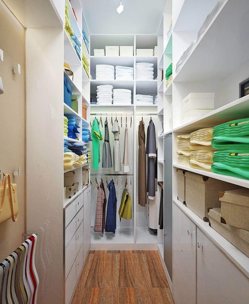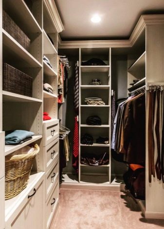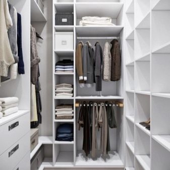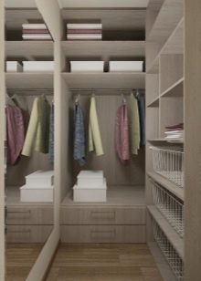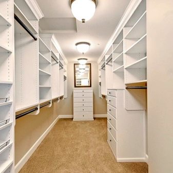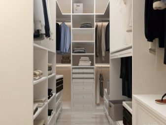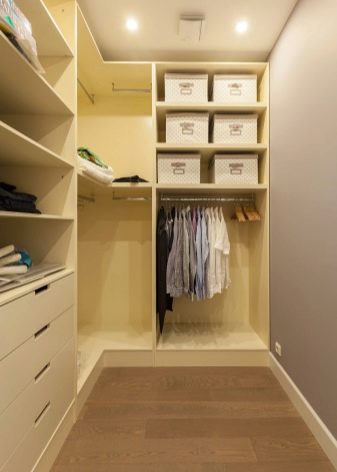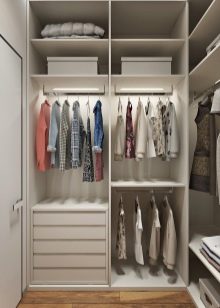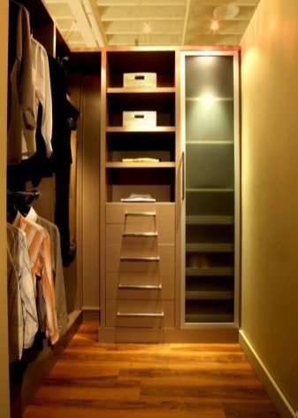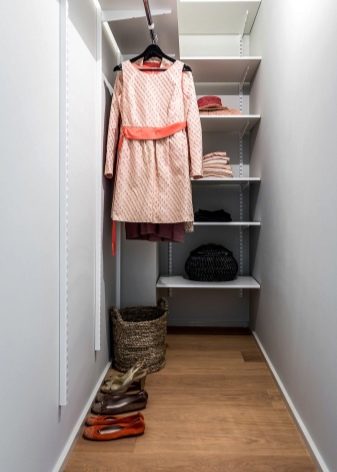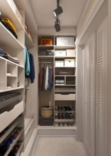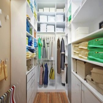 Linear. Diese Option wird am häufigsten verwendet, wenn ein eingebauter schmaler Ankleideraum in einer Speisekammer eingerichtet wird. Ein Raum zum Aufbewahren von Kleidung ähnelt in diesem Fall oft einem gewöhnlichen Kleiderschrank. Alle Regale und Regale befinden sich an einer Wand. Wenn Sie die Tür öffnen, ist die Immobilie sofort sichtbar. Diese Option funktioniert am besten für kleine rechteckige Räume.