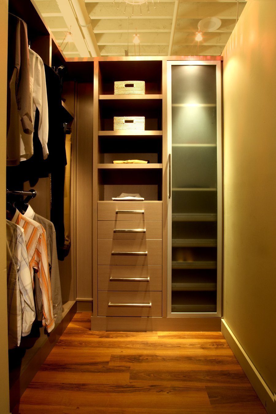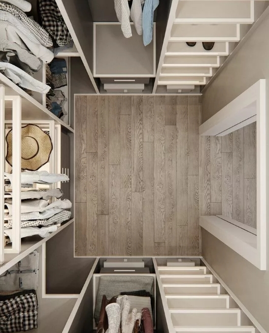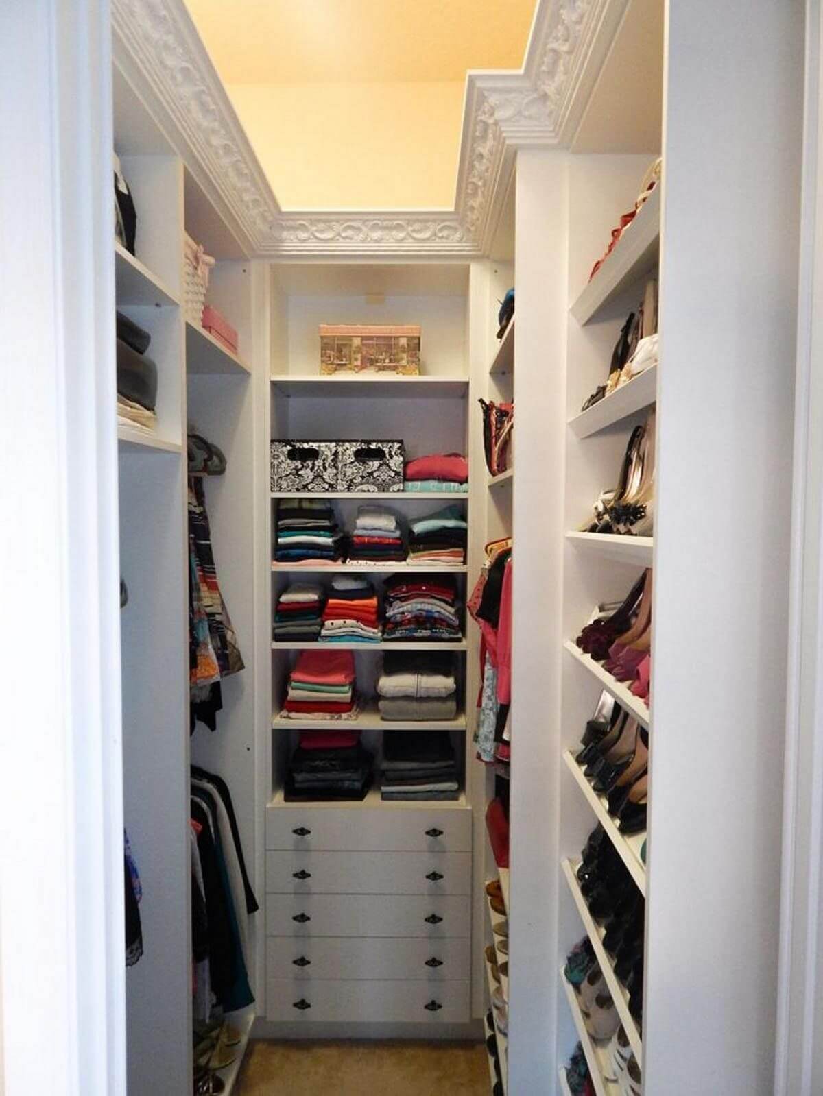 Linear. Diese Option wird am häufigsten verwendet, wenn ein eingebauter schmaler Ankleideraum in einer Speisekammer eingerichtet wird. Ein Raum zum Aufbewahren von Kleidung ähnelt in diesem Fall oft einem gewöhnlichen Kleiderschrank. Alle Regale und Regale befinden sich an einer Wand. Wenn Sie die Tür öffnen, ist die Immobilie sofort sichtbar. Diese Option funktioniert am besten für kleine rechteckige Räume.
