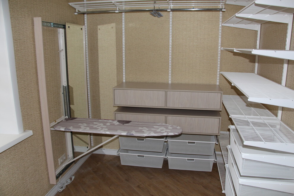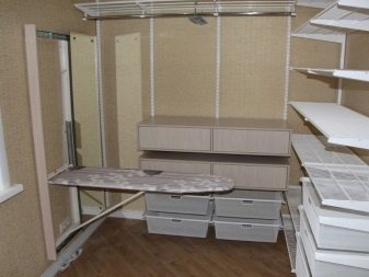 Bügelbrett. Kompakte Modelle werden in der Regel in kleinen Räumen installiert, die sich meist in einer engen Nische zwischen verschiedenen Abschnitten der Garderobe befinden. Es wird empfohlen, es neben der Steckdose und dem Stauraum für das Bügeleisen zu platzieren.