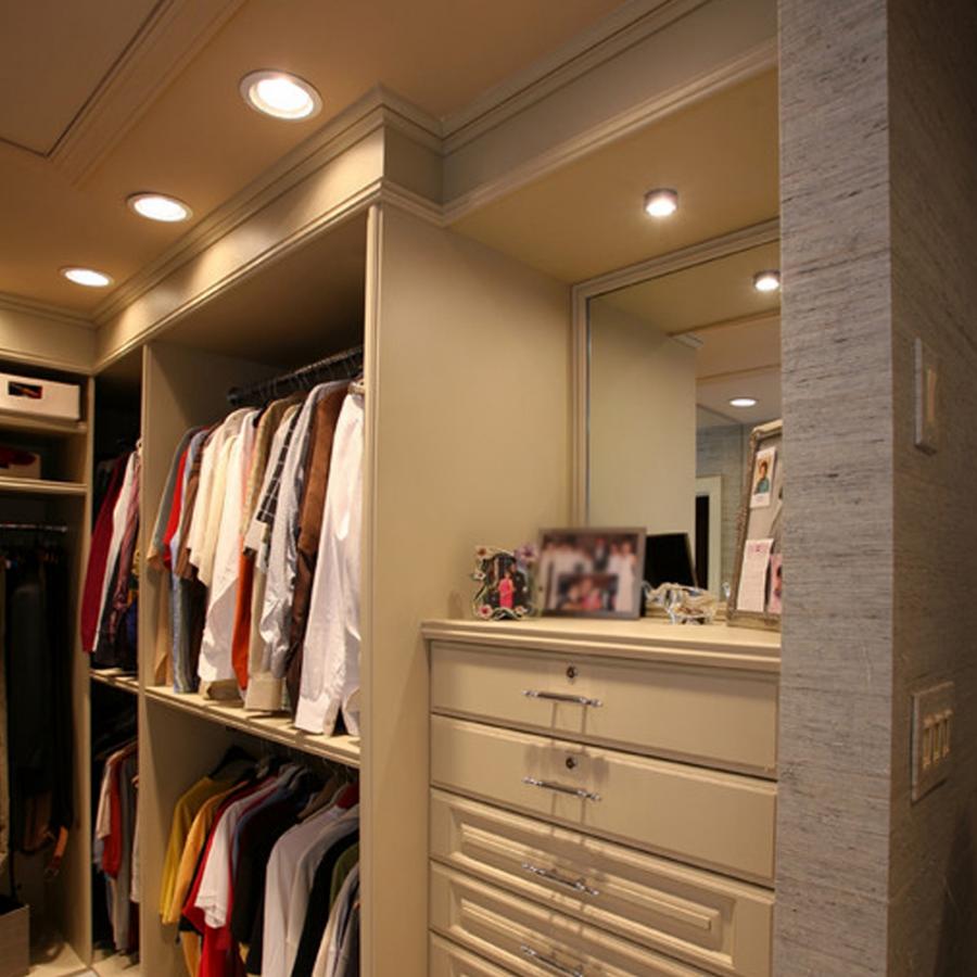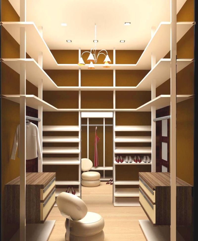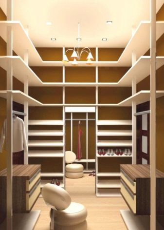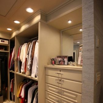 Die beliebteste Option ist die Deckenbeleuchtung. Unter der Decke können eine oder mehrere Lampen angebracht werden. Es hängt alles von der Größe des Raumes ab. Auf kleinem Raum verwenden Sie am besten mehrere kleine Deckenleuchten. In einem großen Raum sollten sie mit einem großen Kronleuchter in der Mitte des Ankleidezimmers kombiniert werden. Für ein Eckzimmer sind kleine Lampen an Wäscheklammern ideal, die bei Bedarf den Neigungswinkel verändern können.