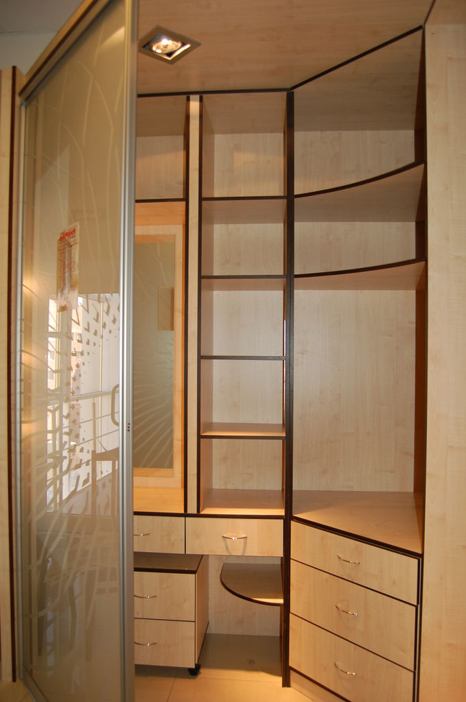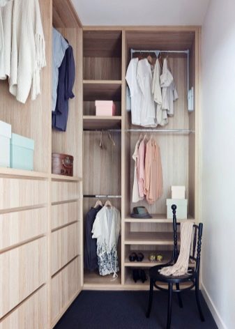 - Ecke. Dieses Aufbewahrungssystem eignet sich gut für nicht standardmäßige Räume. Es ist praktisch, Dinge in einem dreieckigen Kleiderschrank zu falten, aber es ist nicht sehr praktisch, sich umzuziehen, da im Raum nicht viel freier Platz ist.