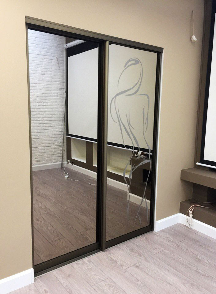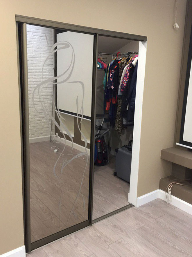 - Spiegel. Dieses Material wird am häufigsten bei der Herstellung von Schiebetüren verwendet. Es zeichnet sich durch seine hohe Festigkeit und Beständigkeit gegen erhöhte Belastungen aus. Diese Art von Türstruktur hat eine Vielzahl von Vorteilen. Zuallererst ist es praktisch, sie als gewöhnlichen Spiegel zu verwenden und interessante Bilder zu sammeln. Darüber hinaus können Sie mit einer Spiegeltür den Raum des Flurs oder Wohnzimmers optisch vergrößern. Spiegeltüren passen perfekt in jedes Interieur.