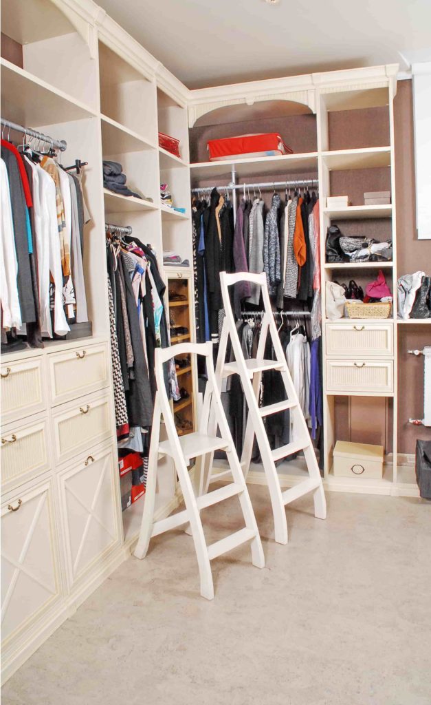 - Klappleiter. Es muss in hohen Umkleidekabinen installiert werden. In diesem Fall ist es bequemer, die benötigten Dinge aus den oberen Regalen zu holen, als einfache Hocker zu verwenden. Trittleitern werden wie Bügelbretter meistens in speziellen Nischen versteckt.