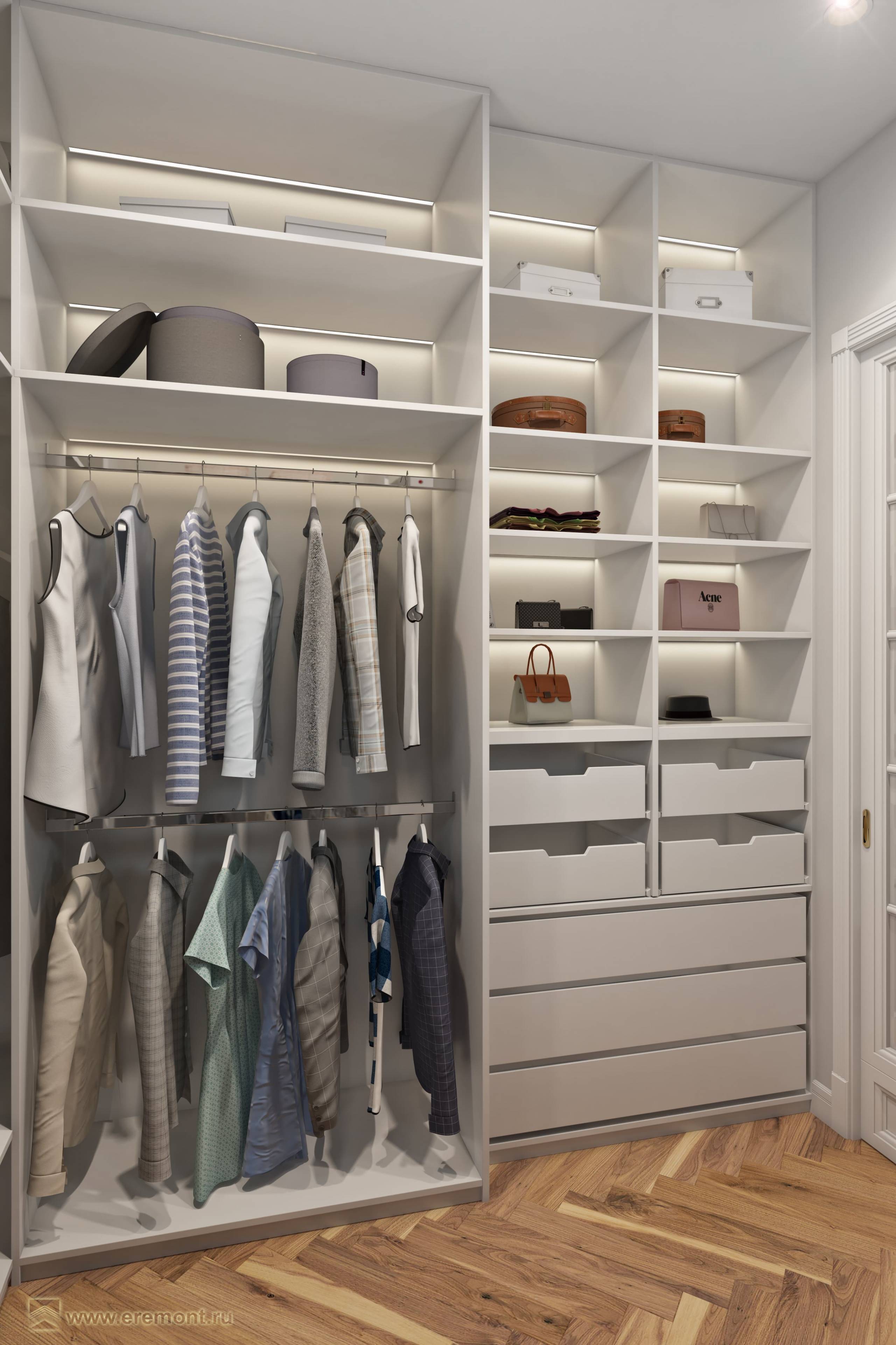 Der erste Schritt ist die Entscheidung für das Speichersystem. Wenn Sie sich darauf konzentrieren, wo und wie die Regale, Schränke und Kleiderbügel installiert werden, können Sie vollwertige Zeichnungen des zukünftigen Raums erstellen.