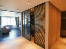 Faltbar. Diese nicht standardmäßigen Produkte berühren den Bodenbelag nicht, da die Schienenteile zusammen mit den beweglichen Rollen und Führungen an der Decke oder Oberdecke montiert werden. Falttüren werden am Falz mit einfachen Scharnieren miteinander verbunden. Wenn ein ziehharmonikaförmiges Produkt verwendet wird, kann eine große Anzahl von Klappen erforderlich sein (10-12 x 1,5-2 Meter).