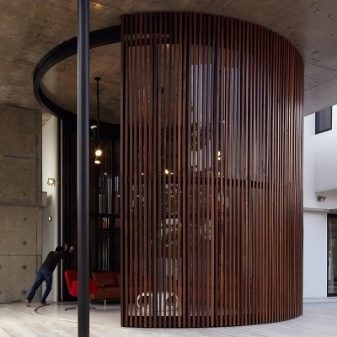 Zahnstange und Ritzel. Diese Option hat ein originelles externes Design. Die Türen können mit Scharnieren, Schiebetüren oder Falttüren ausgeführt werden. Produkte dieser Art weisen einen Steg aus vielen Streifen auf, die schräg zur Ebene befestigt sind. Dadurch werden Löcher gebildet, durch die Luft in das Innere der Umkleidekabine eindringen kann.