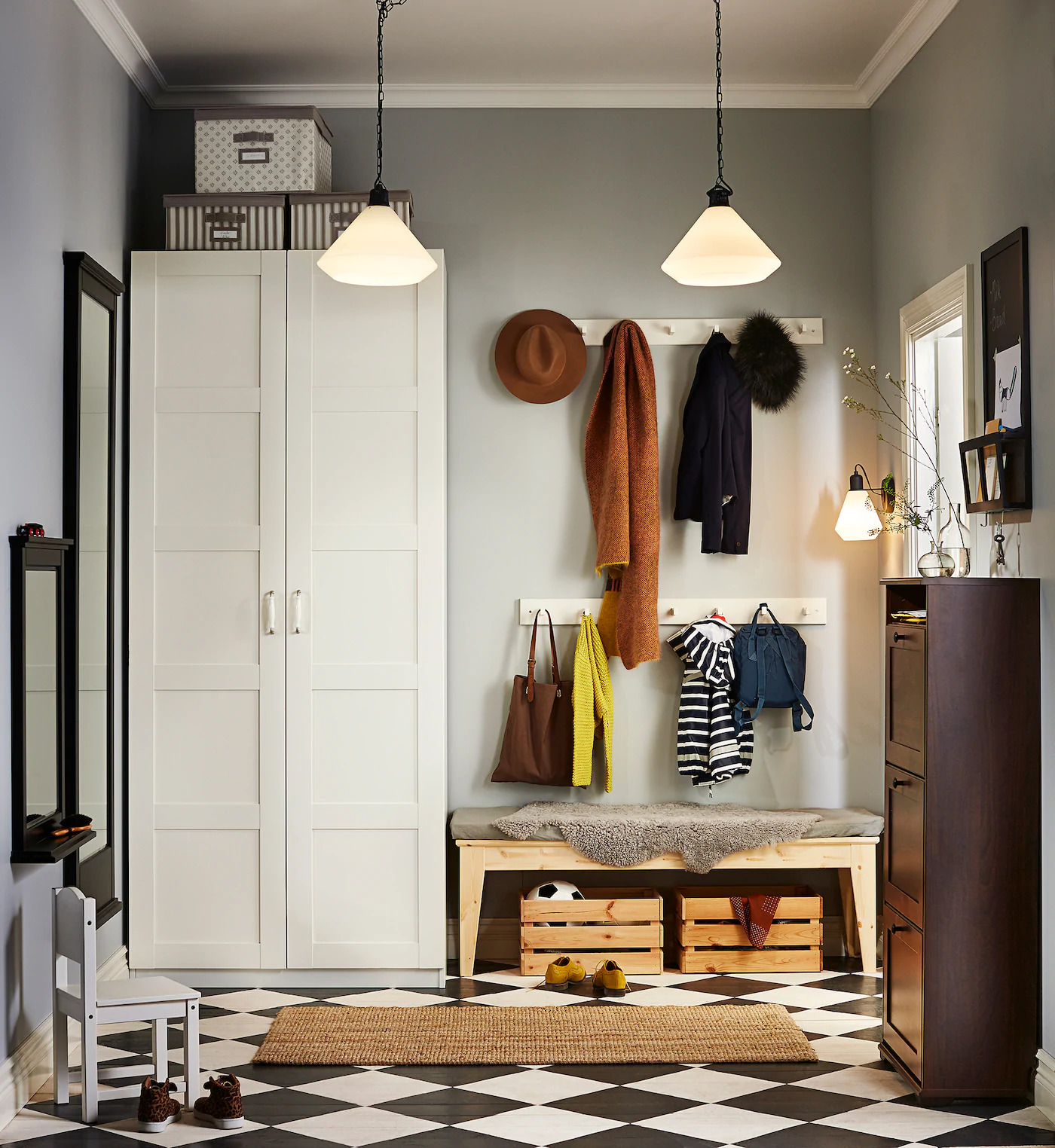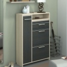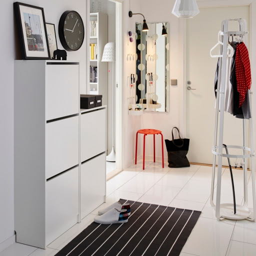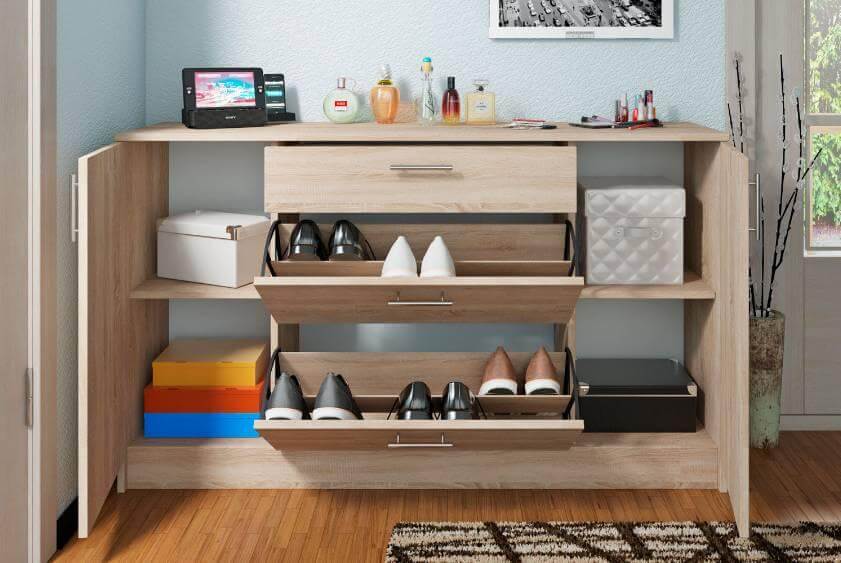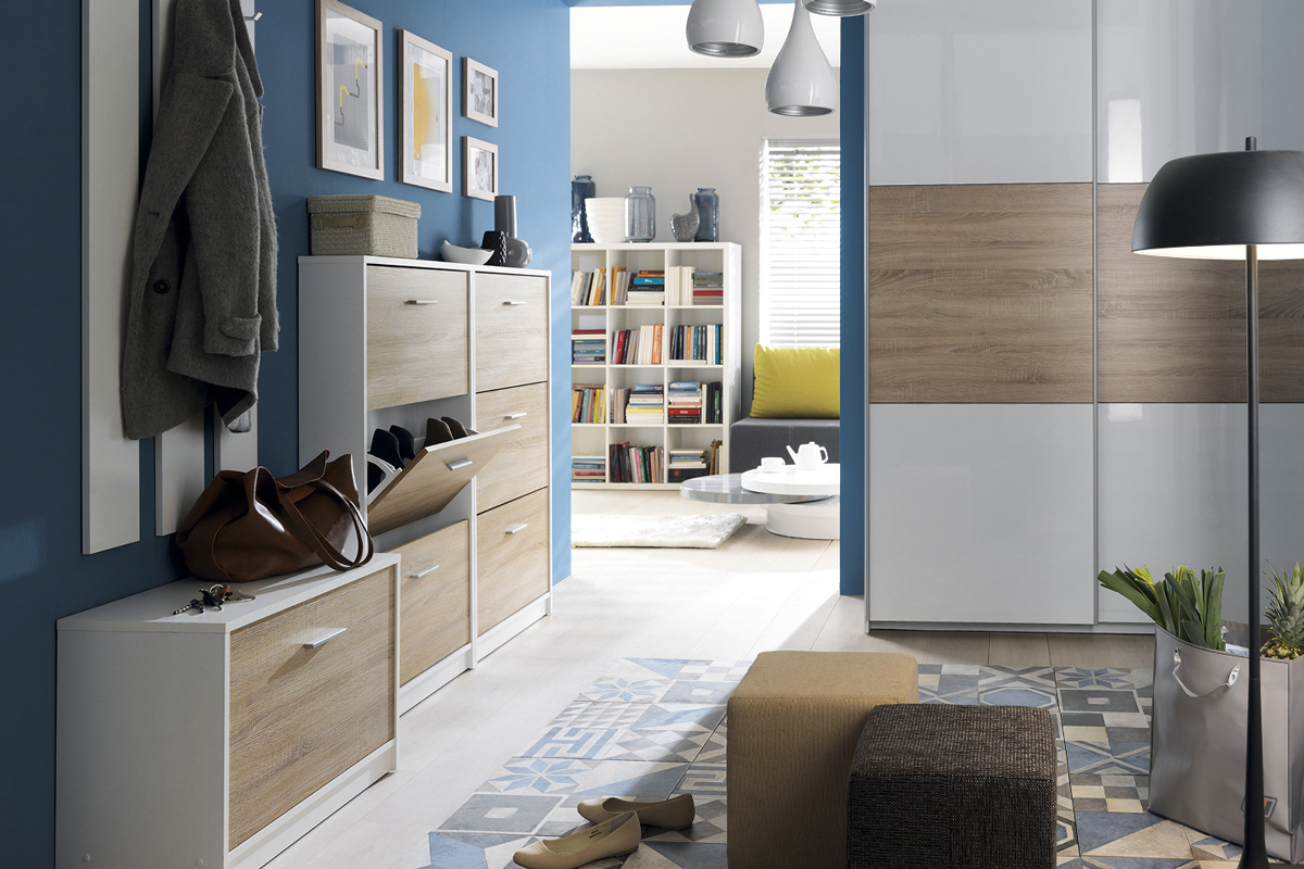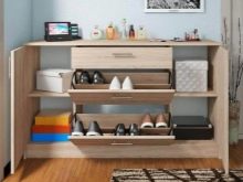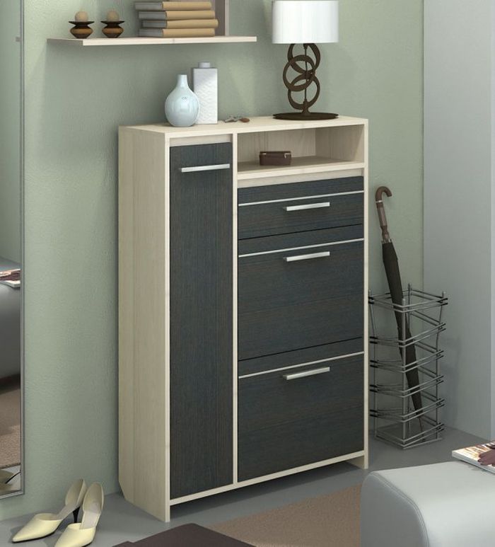 - Hohe und schmale Kommoden können wie in diesem Beispiel zu Schuhregalen werden. Die Möbel sind komplett, nicht "stumpf", sie erfrischen den Raum sehr.