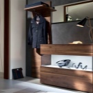- Die braune schmale Kommode fällt nicht sofort auf, was in diesem Fall ein Plus ist. Es fällt nicht ins Auge und überlagert nicht das harmonische Bild aus einem schmalen Hochschrank und einer bequemen Sitzbank.