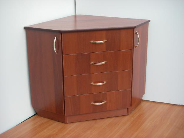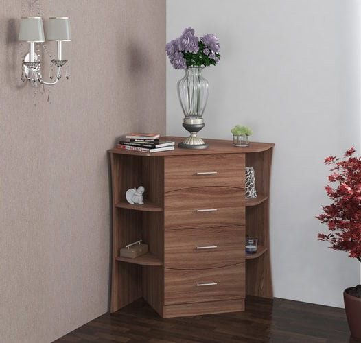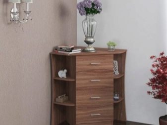 Eckkommoden im Flur können so oft genutzt werden wie in keinem anderen Raum. Gleichzeitig sind sie dreieckig und trapezförmig. Wenn der Flur quadratisch ist und sich am Eingang der Wohnung eine Art Ecke in der visuellen Mitte befindet, kann eine solche Kommode es einfach vertragen. Es ist normalerweise geräumig und sein Inneres ersetzt einen kleinen Schrank. Normalerweise haben diese Kommoden Beine, aber nicht unbedingt.