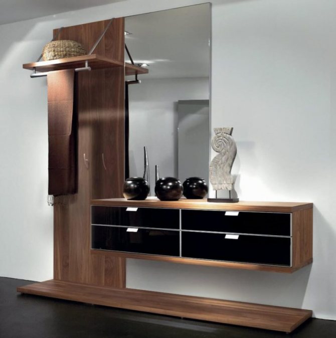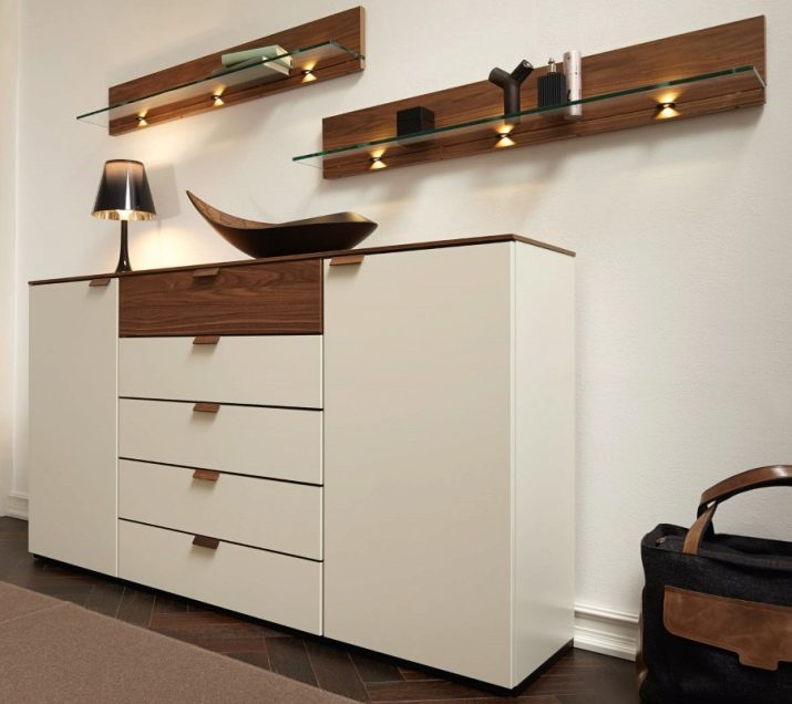 Der Nachteil von hängenden Kommoden ist, dass Sie Löcher in die Wand bohren müssen, um Befestigungselemente zu schaffen, die die Möbel halten. Aber wenn die Designlösung den Flur positiv verändert, können Sie ein solches Opfer bringen.