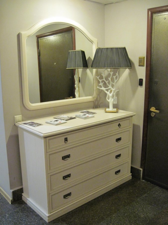 - Termin. Lange Produkte können sogar einen Kleiderschrank in gewisser Weise ersetzen. Aber eine Kommode mit Spiegel (und solche gibt es auch) kann als Schminktisch dienen, was manchmal auch notwendig ist.