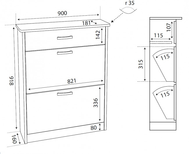 - Länge. Bestimmt durch den Abstand zwischen den Außenflächen der Seitenwände. Je länger die Länge, desto geräumiger ist die Kommode in den meisten Fällen. Möbel mit einer Länge von weniger als 50 cm werden nicht als praktikabel angesehen. Die Mindestlänge beträgt 60 cm.In diesen Kommoden können Taschen, Schuhe und Accessoires aufbewahrt werden. Der Standard ist 80-100 cm, Sie können alles in langen Modellen verstauen, sie können einteilig oder zwei- oder sogar dreiteilig sein. Ab 100 cm - das sind schon lange Modelle in mehreren Abschnitten. Oftmals werden diese als einziges autarkes Element an die Wand gestellt, d. h. dieselbe Wand hat weder einen Schrank noch eine Bank.