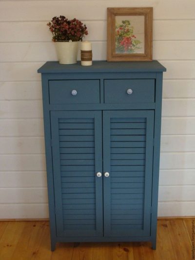 - Eine schmale Kommode mit Lamellentüren, möglicherweise selbstgebaut. Sieht bezaubernd und eigenständig aus.