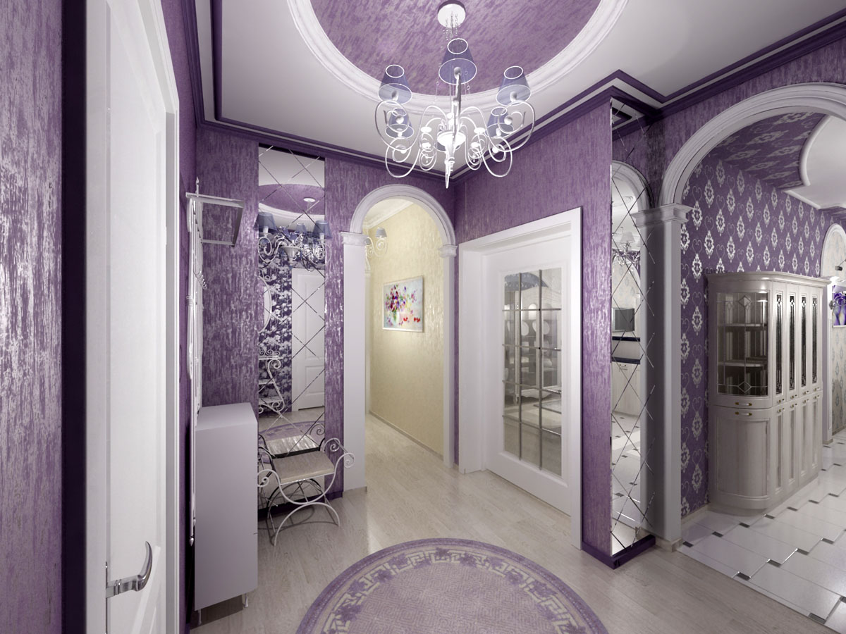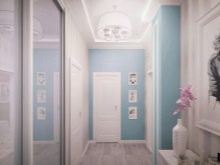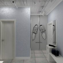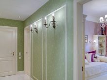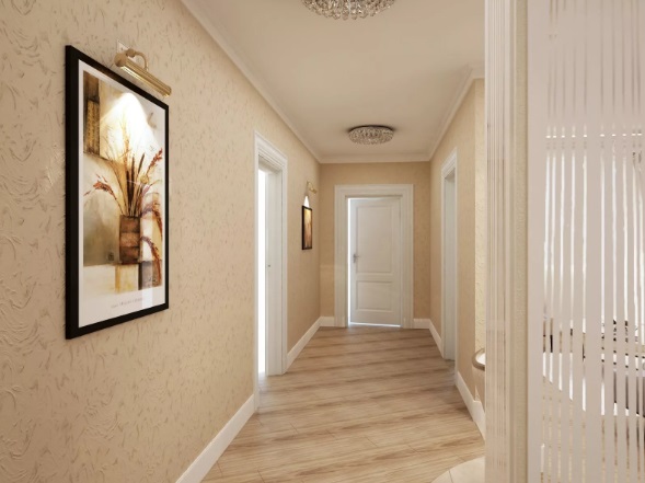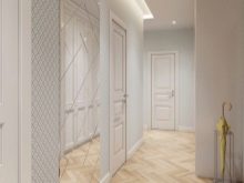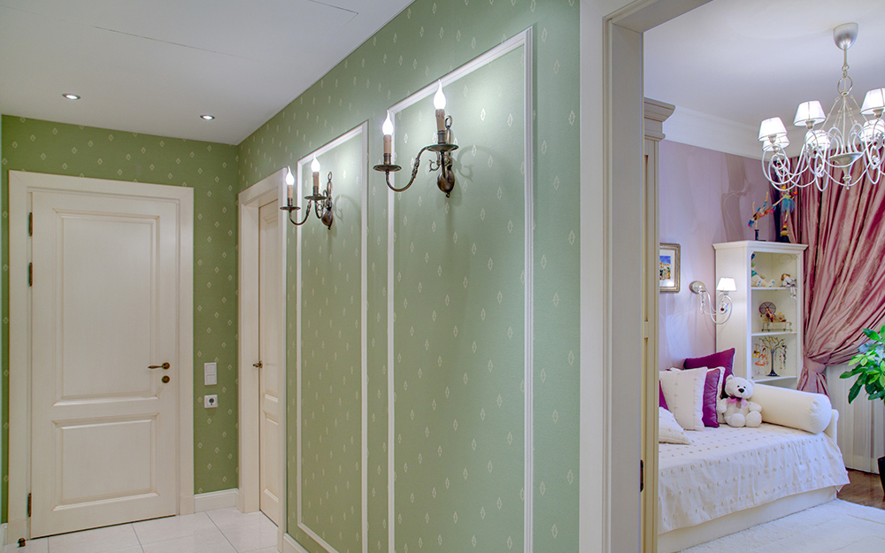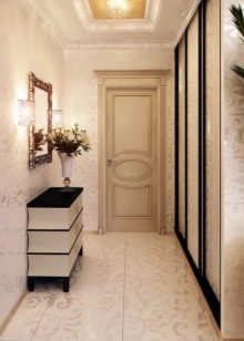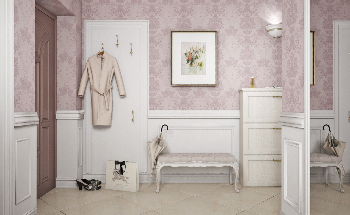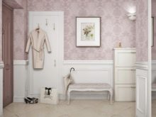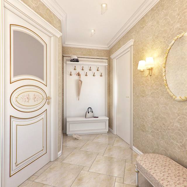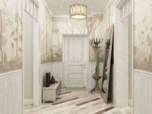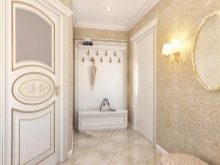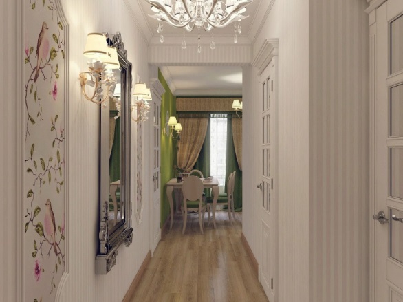 Wenn die gesamte Wohnung ursprünglich klassisch geplant war, sieht man im Flur unter den hellen Türen helle Tapeten mit kleinen Blumen, Schmetterlingen oder Locken. Dieses Dekor ist in den letzten Jahren sehr relevant.