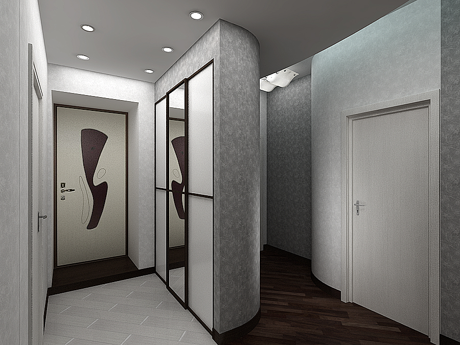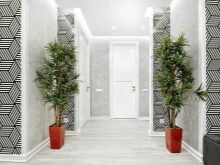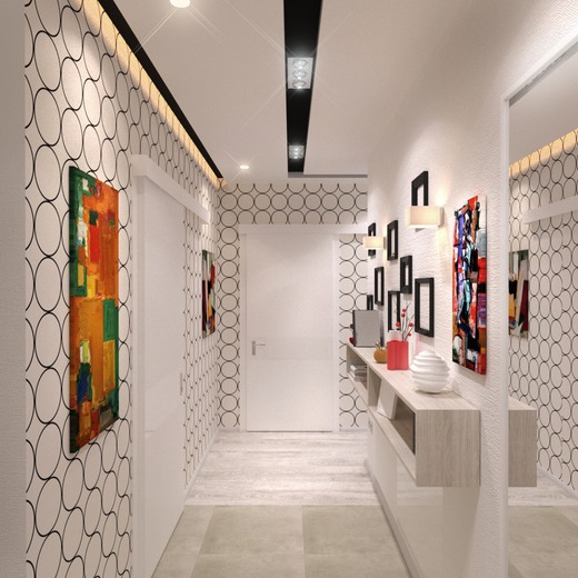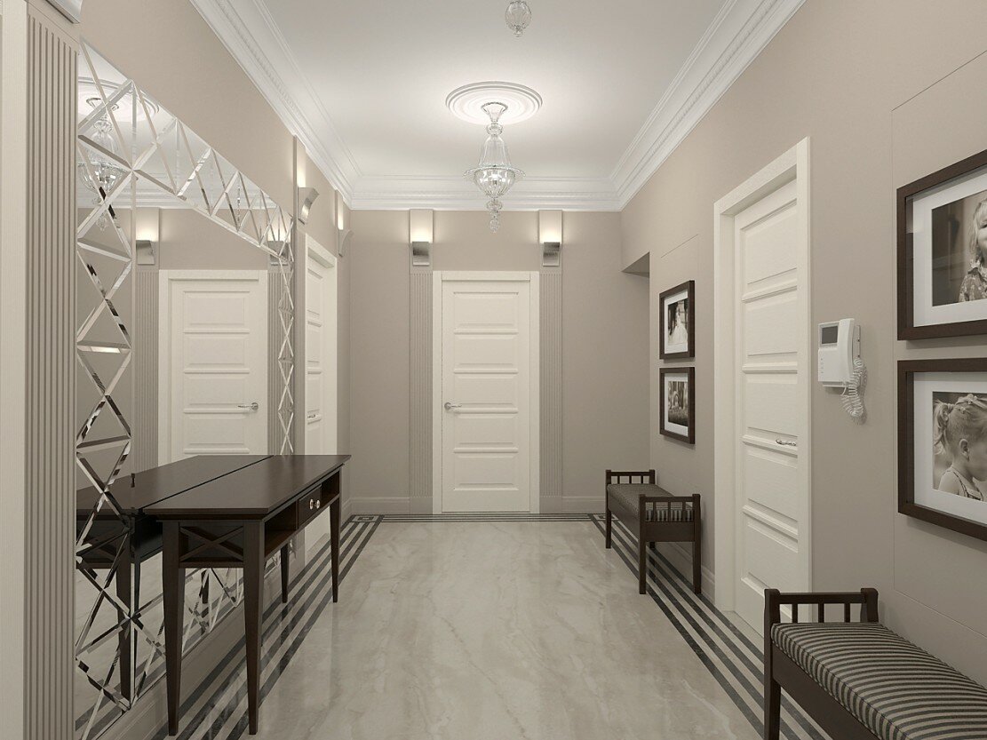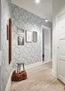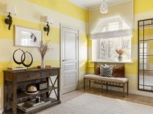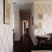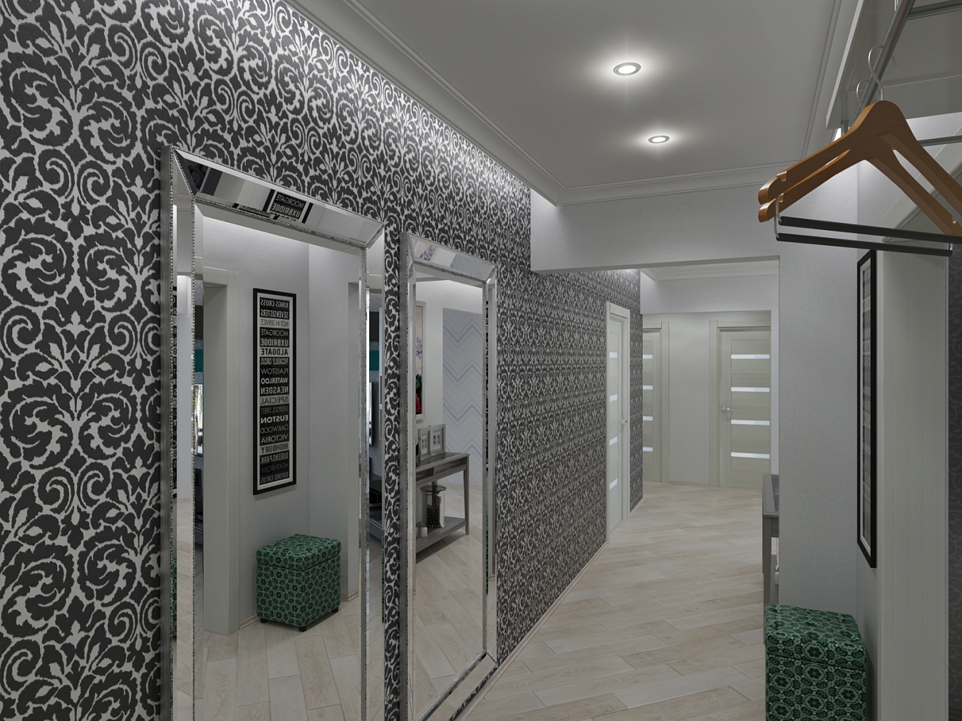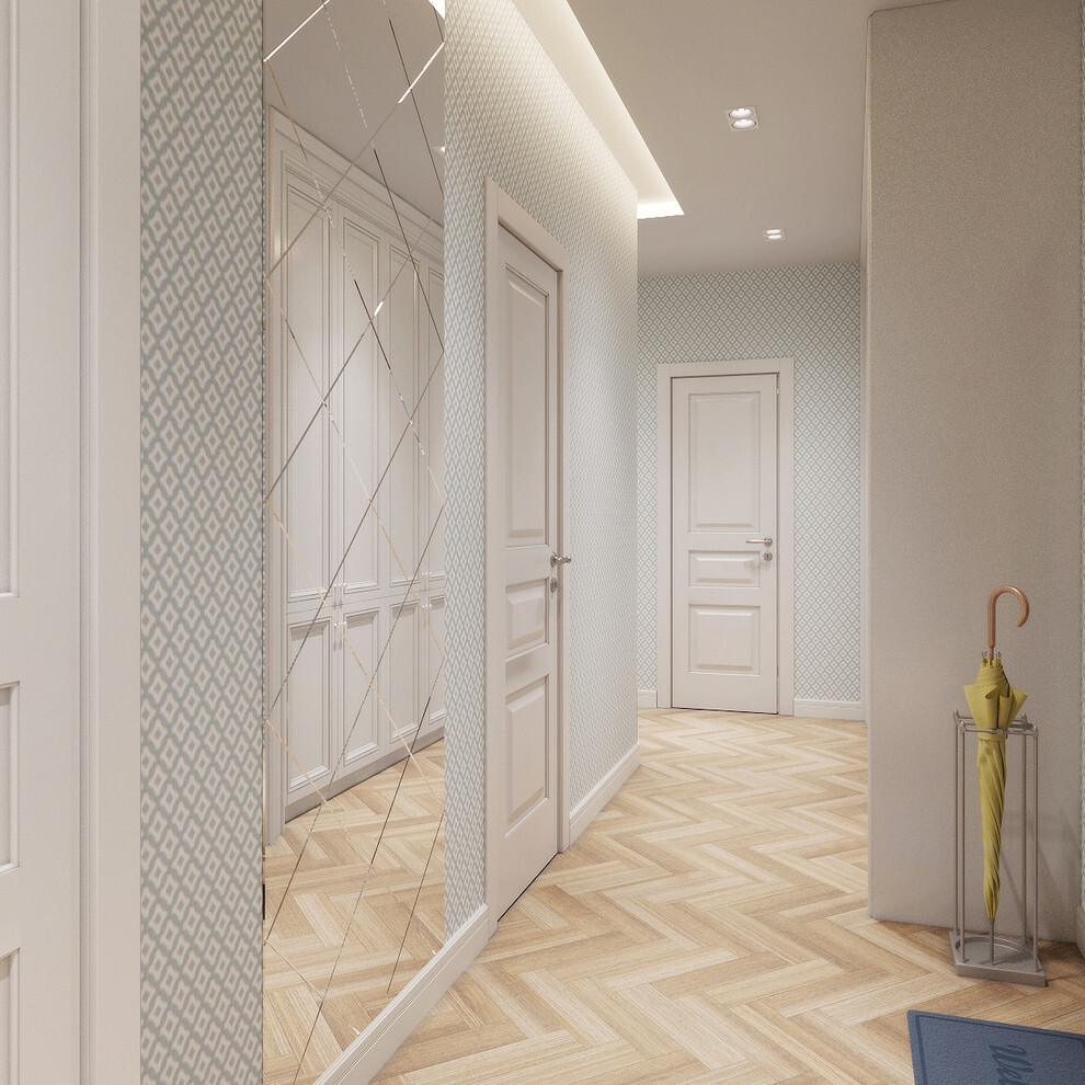 Wenn die gesamte Wohnung ursprünglich klassisch geplant war, sieht man im Flur unter den hellen Türen helle Tapeten mit kleinen Blumen, Schmetterlingen oder Locken. Dieses Dekor ist in den letzten Jahren sehr relevant.