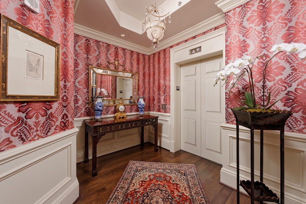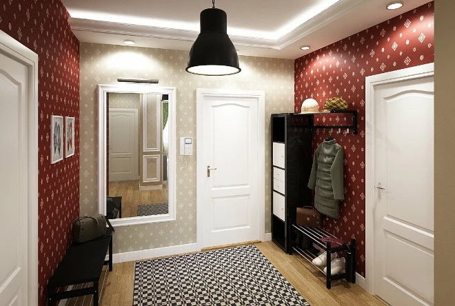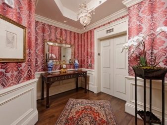 Für klassische Innenräume ist es angebracht, dunkle Farbtöne mit hellen Türen zu verwenden. Tapeten in Burgunder- oder Paprikafarbe sehen gut aus, aber es ist besser, wenn sie nur die Hälfte der Wand einnehmen und darunter dekorative Paneele angebracht werden können, oder es können Beläge in einem anderen Farbton, heller, verwendet werden.