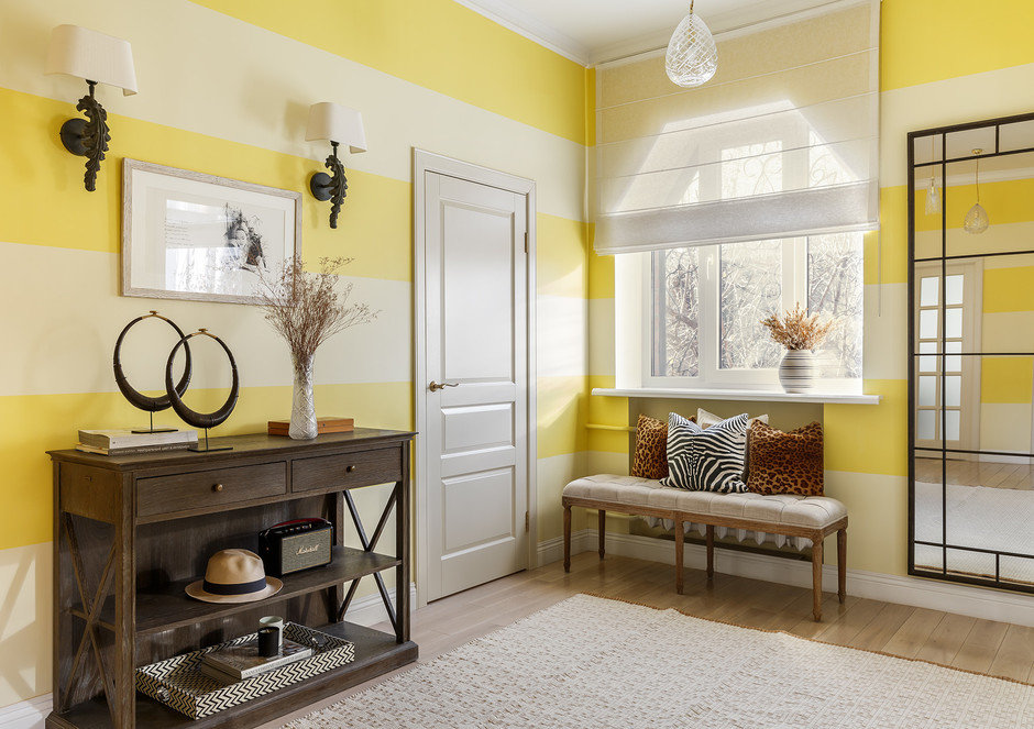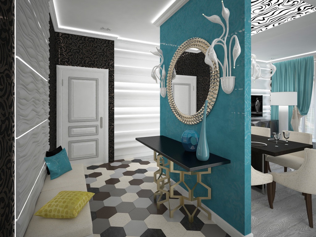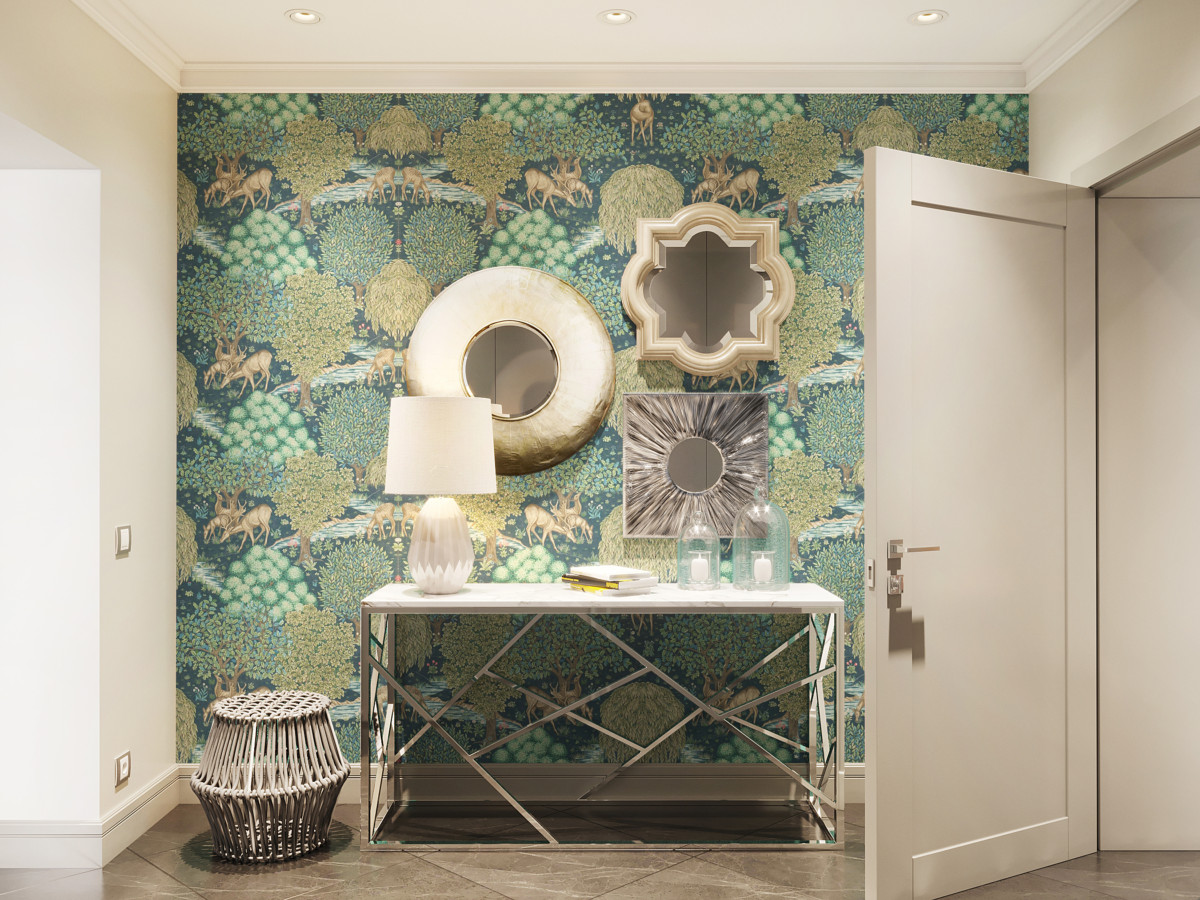 Für einen modernen Stil können Sie unter einer weißen Tür auf schlichte hellblaue Tapeten, helle Pistazie und helle Zitrone achten. Auch die Wände in einem Raum mit weißer Tür können mit verschiedenen Tapeten beklebt werden, wenn es die Raumfläche zulässt. Wir empfehlen einen Blick in die Eingangshalle zu werfen, wo mehrere Wände mit hellblauen Tapeten und einige mit Blumendruck verkleidet sind. Aber sie verbinden sich mit einem Knall. Um sich bei der Kombination nicht zu verrechnen, empfehlen wir Ihnen, Tapeten derselben Marke und derselben Kollektion zu wählen.