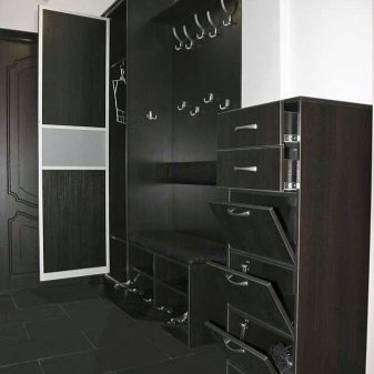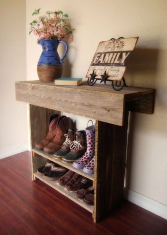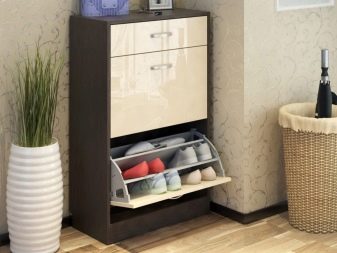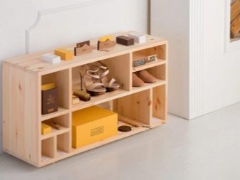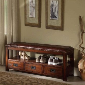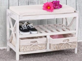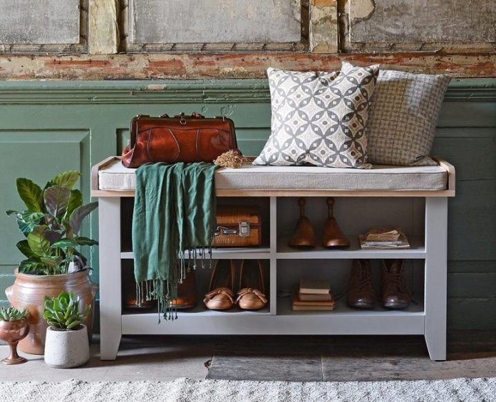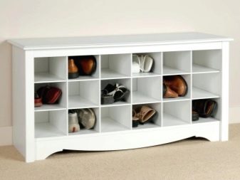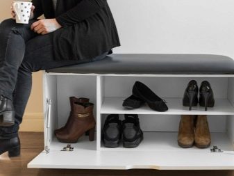 Die Regale mit Sitzen sind bequem und nehmen nicht viel Platz ein. Bei einem solchen Modell müssen Sie beim An- oder Ausziehen von Schuhen keinen Stuhl herausnehmen oder nach einem Sitzplatz suchen. Regale mit Sitzen sehen aus wie behelfsmäßige Stühle und sehen in jedem Interieur toll aus.
