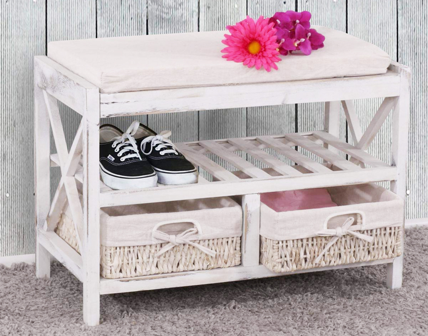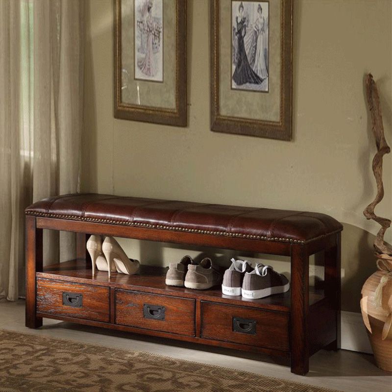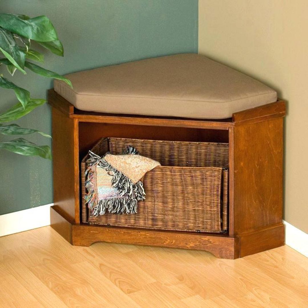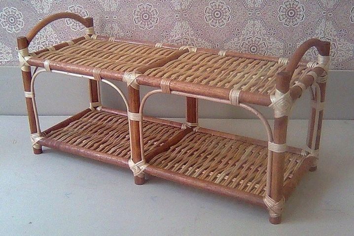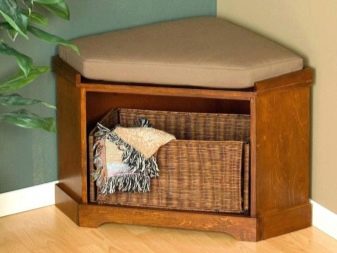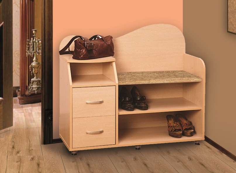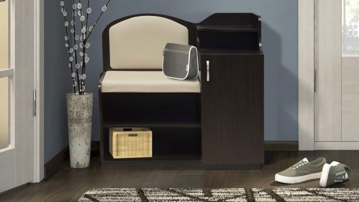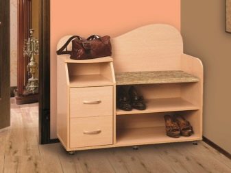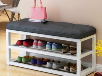 Ein Regal mit Sitz kann recht klein sein. Der Bezug hat unbedingt eine bequeme Sitzfläche, auf der Sie beim Aus- oder Anziehen der Schuhe sitzen können. Es kann aus verschiedenen Materialien hergestellt werden.