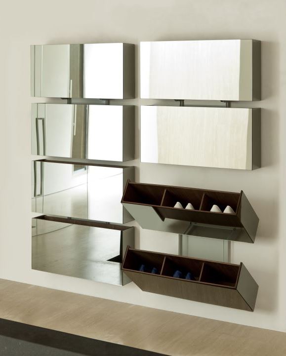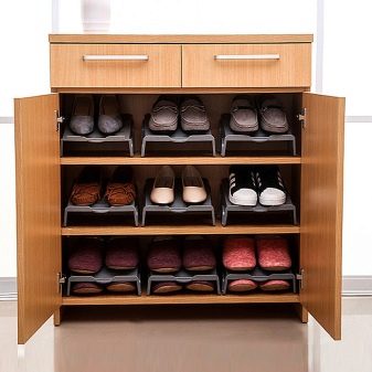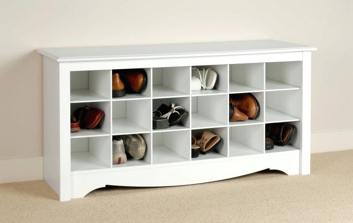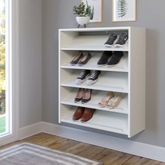 Zum Verkauf stehen sowohl rechteckige oder quadratische Modelle, die als klassisch gelten, als auch nicht standardmäßige Eckregale. Letztere ermöglichen es Ihnen, Platz zu sparen und Eckbereiche, die oft unbeansprucht bleiben, sinnvoll zu nutzen. Alle Modelle ermöglichen es Ihnen, Schuhe zu platzieren und vor Staubansammlungen zu schützen. In das Regal können Sie nicht nur Schuhe oder Stiefel, sondern auch Kosmetika zur Schuhpflege stellen.