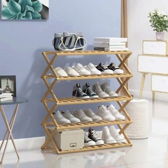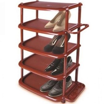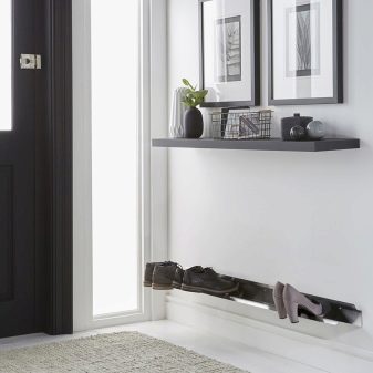 Offene und leichte Regale eignen sich hervorragend zum Aufbewahren von Saisonschuhen. Schuhe trocknen auf offenen Gestellen sehr schnell, da in solchen Strukturen leicht Luft zirkulieren kann. Dies ist eine gute Option für einen kleinen Korridor. Die Pflege von Metallmodellen ist sehr einfach.